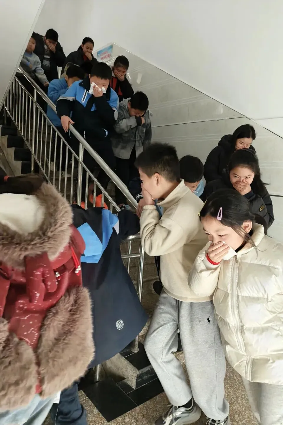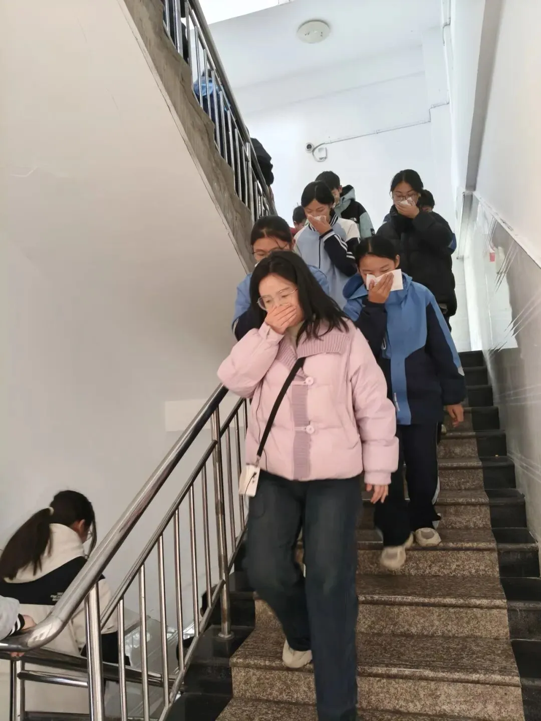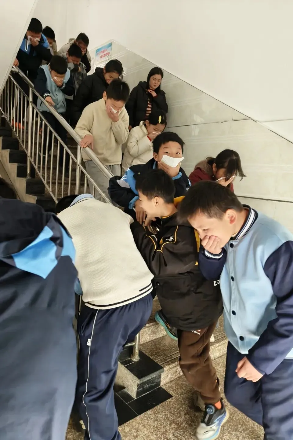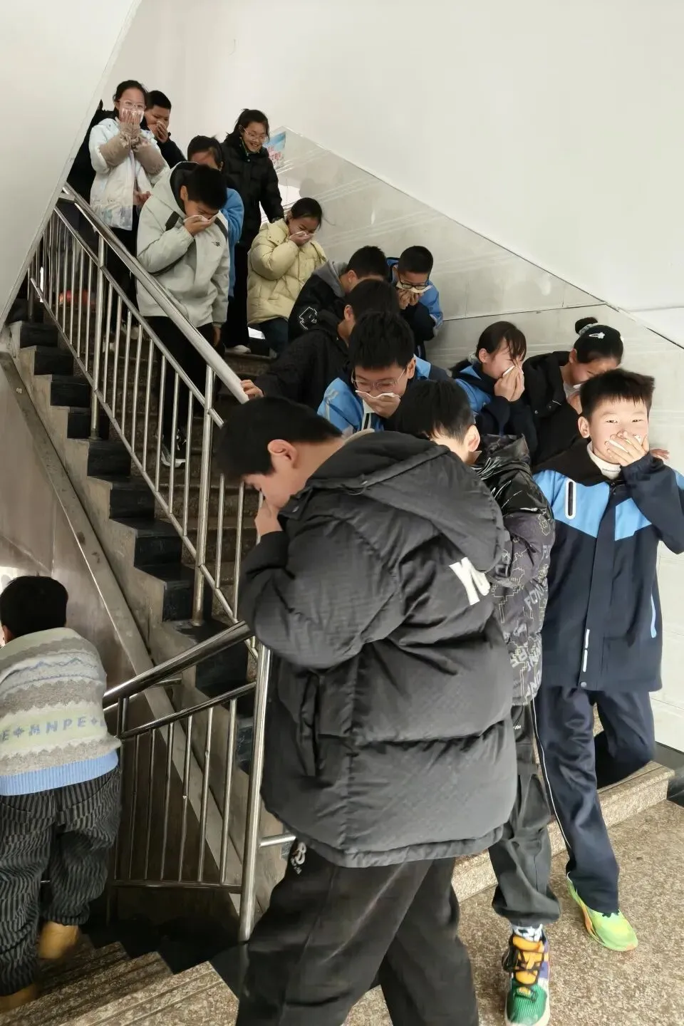 听到警报声后,各班班主任及任课老师迅速反应,立即组织学生进入应急状态。学生们在老师的指挥下,迅速捂住口鼻,弯腰低头,严格按照预先设定的疏散路线,快速、有序地从教室撤离。