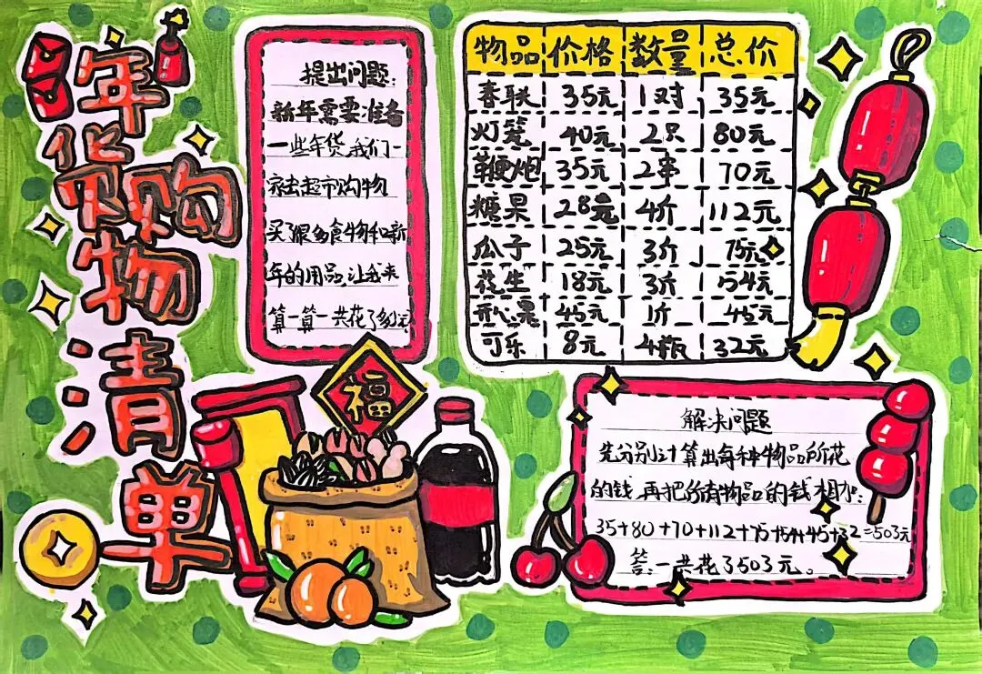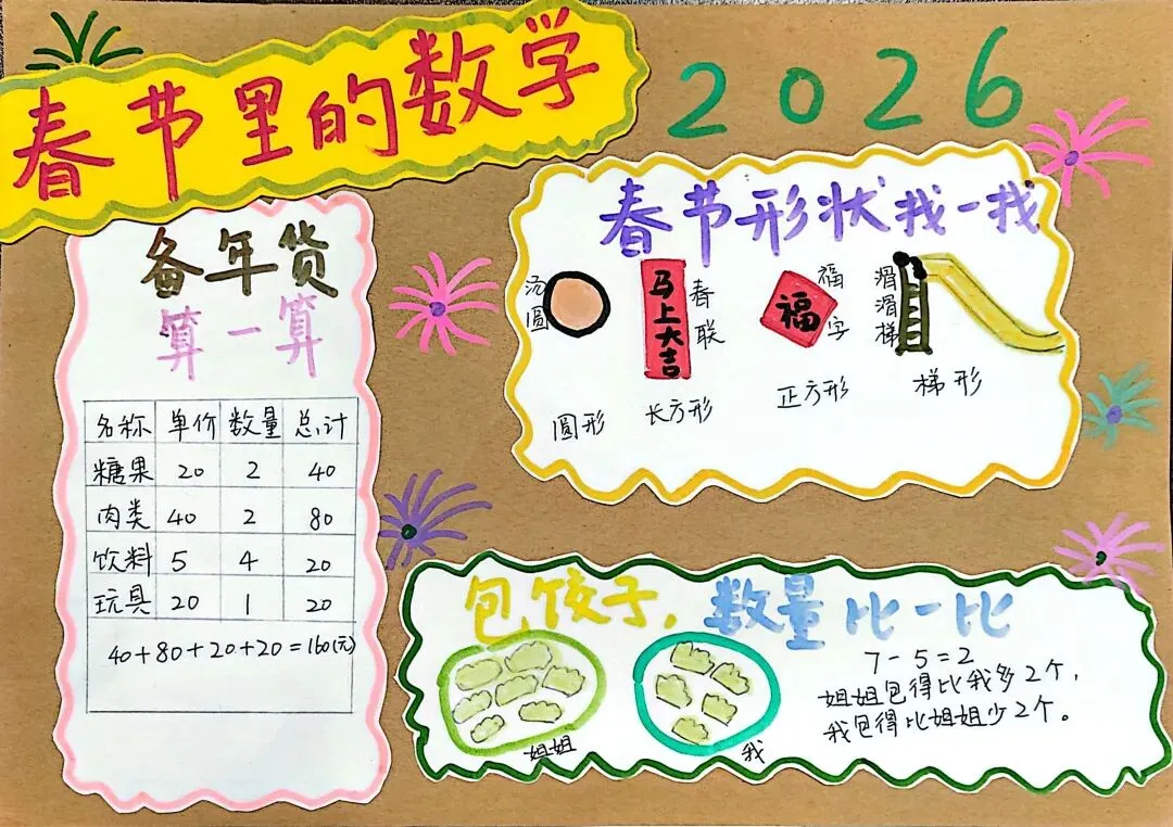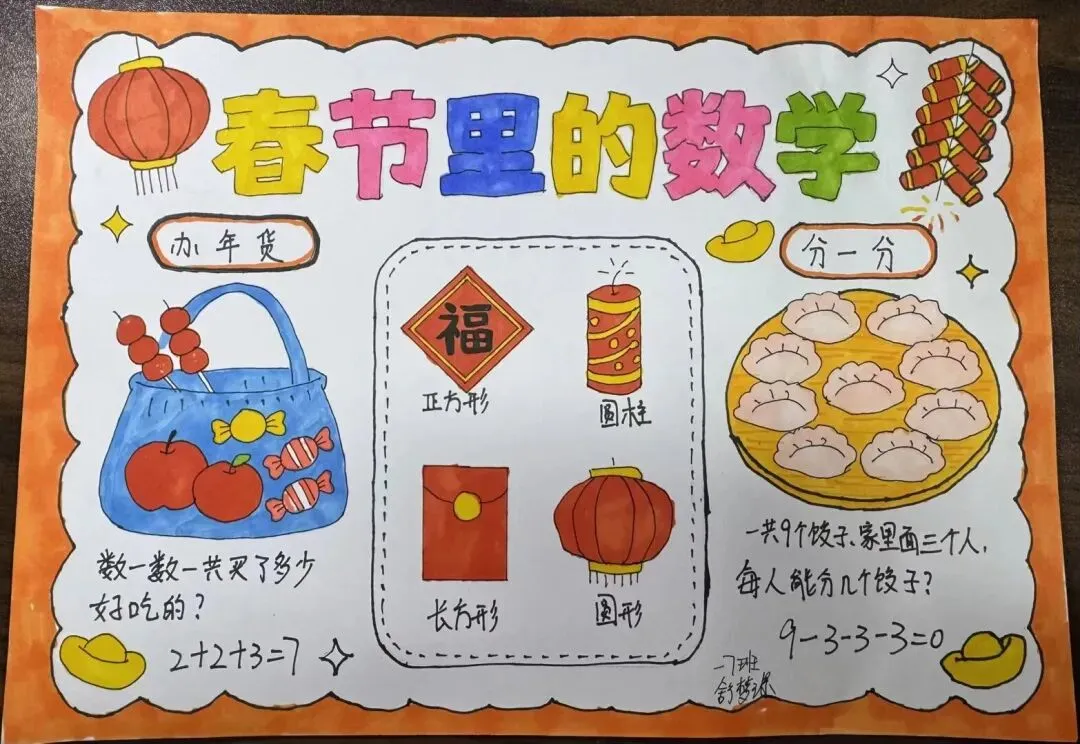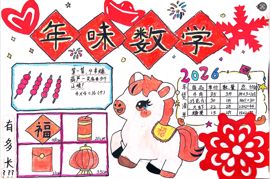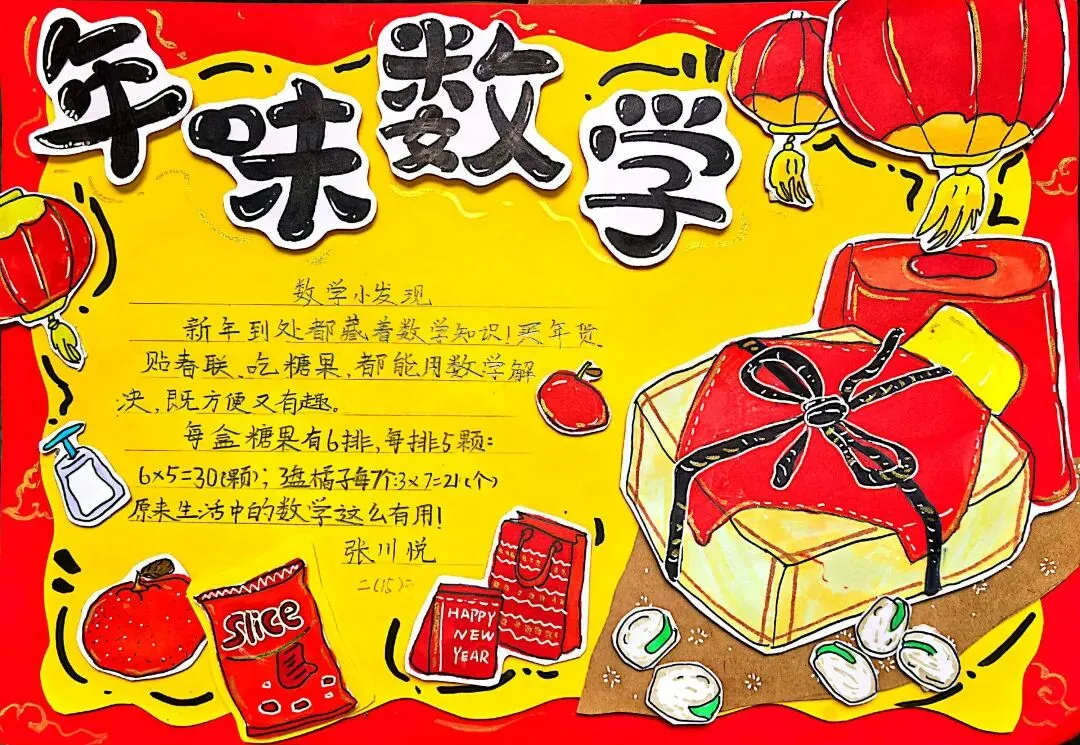冬去春来,暖意渐浓,为全面落实教育部关于深化教育教学改革、推进实践育人的指导意见,学校立足“双减”背景,精心设计了以“年味里的数学”为主题的分年级寒假实践作业。孩子们在探寻年味的过程中,用数学的眼光观察现实世界,用数学的思维思考现实世界,用数学的语言表达现实世界,在年味中探寻数字的秘密,在生活里运用数学的智慧。一幅幅充满童趣的实践作业,记录着他们的观察与思考,也见证着他们在“做中学”的快乐与成长。让我们一同走进这场年味与数学交融的盛宴!