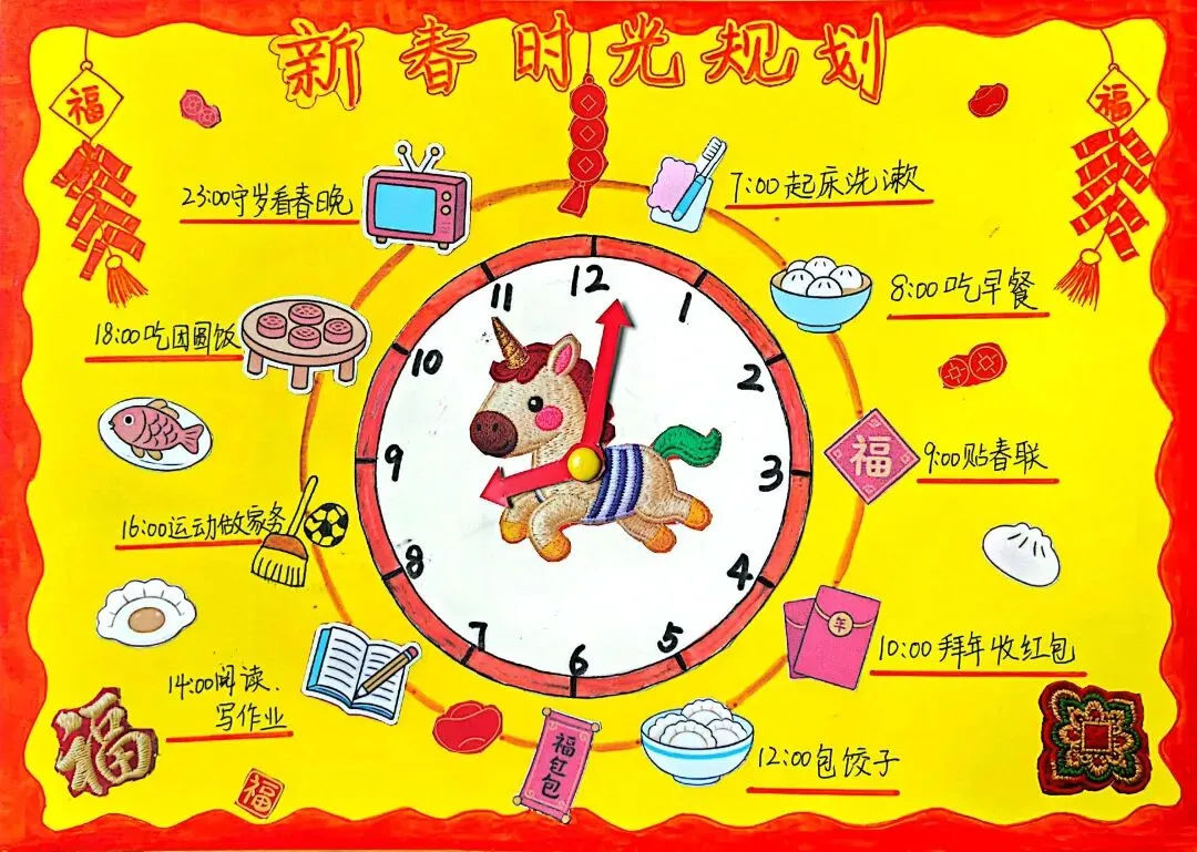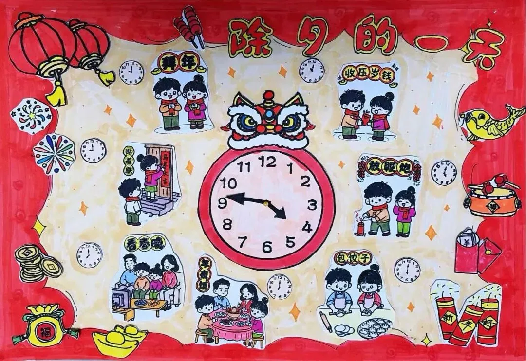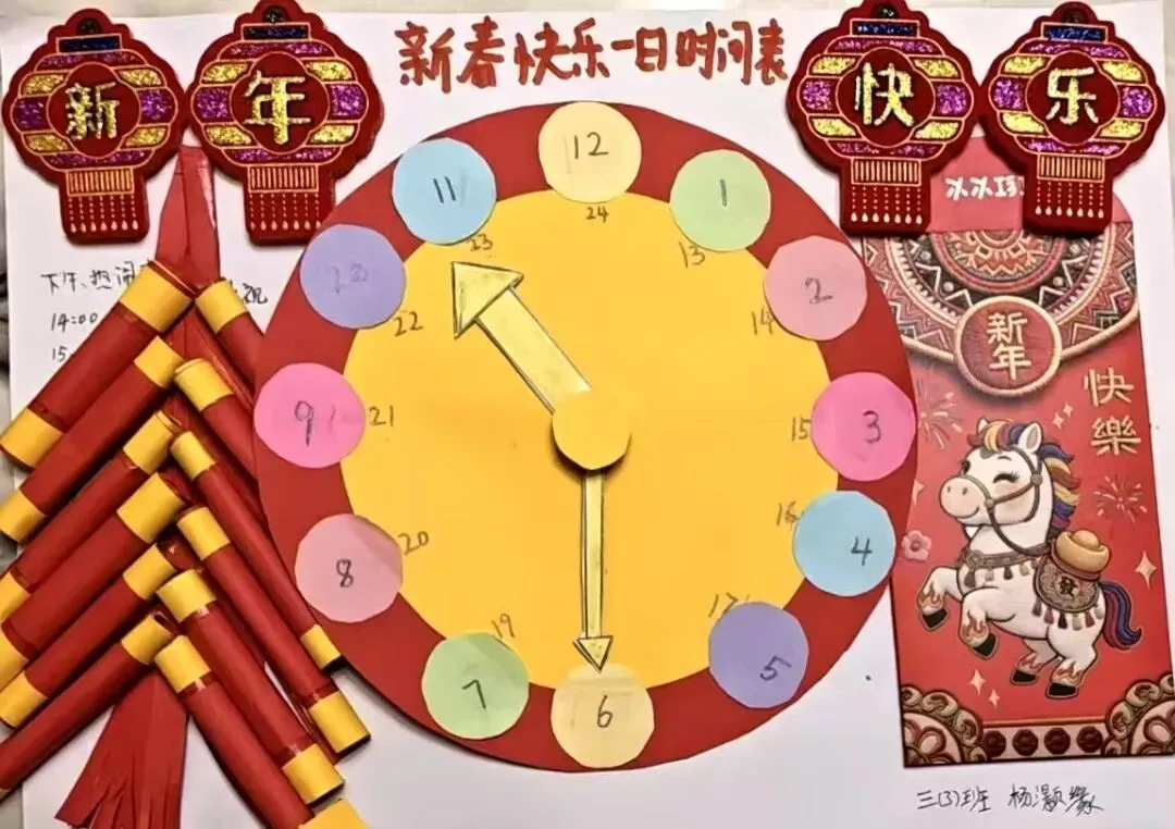 三年级的“时间管理小达人”把春节一天安排得明明白白——上午贴春联,下午去拜年,晚上守岁看春晚,全都画在了钟面时间表上!还有同学用废旧红包做出能转动的钟表模型,拨动指针,时间就在指尖流淌呢!