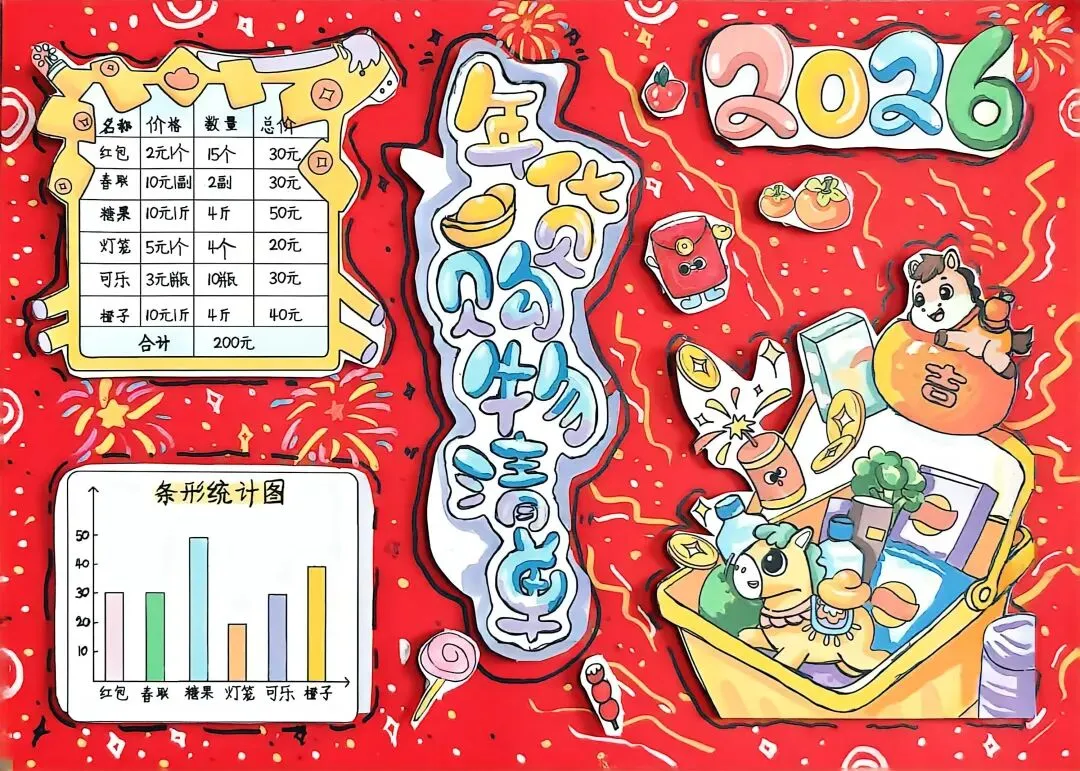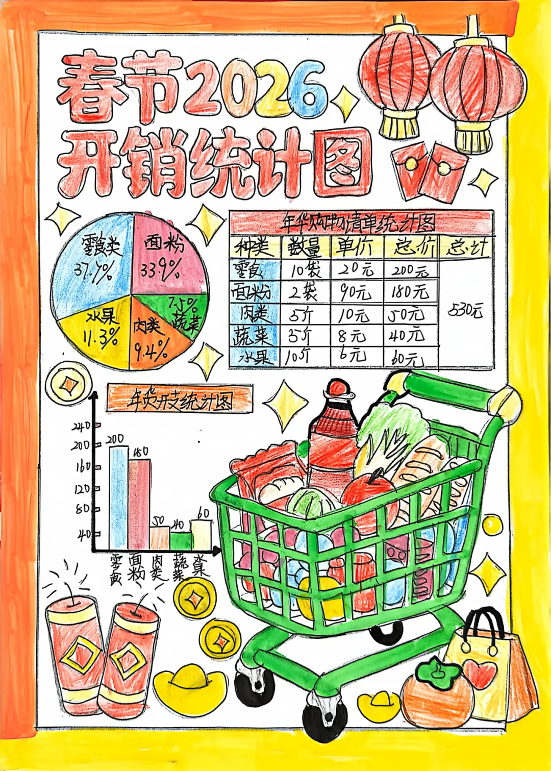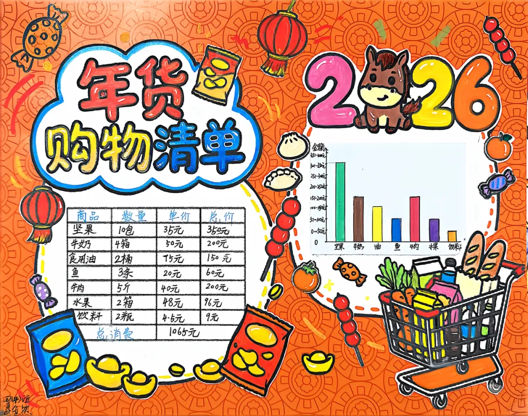 四年级的“消费统计官”们把年货清单变成了数学乐园——零食花了多少钱?春联买了几副?一一记在统计表里。再用红彤彤、金灿灿的彩笔画出一根根条形,食品类最高,装饰类也不少!最后还写上“年货不浪费,理性消费最可贵”的小建议,真是生活小能手!