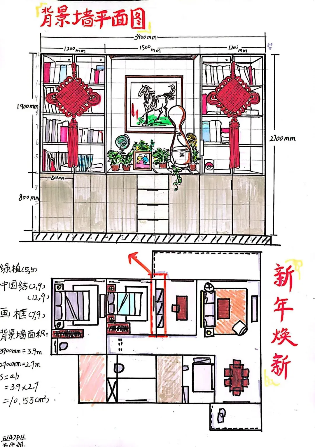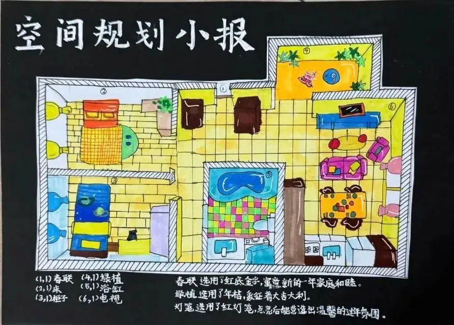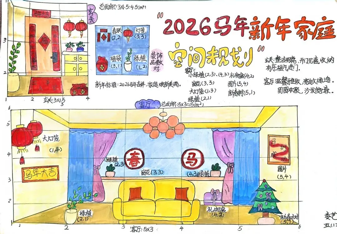 五年级的“空间规划师”拿起尺子,量客厅、画平面图,再用数对给春联找个好位置,给绿植安个家。瞧,玄关摆上红灯笼,茶几放上吉祥果,数学里的方向和坐标,把家装扮得焕然一新!