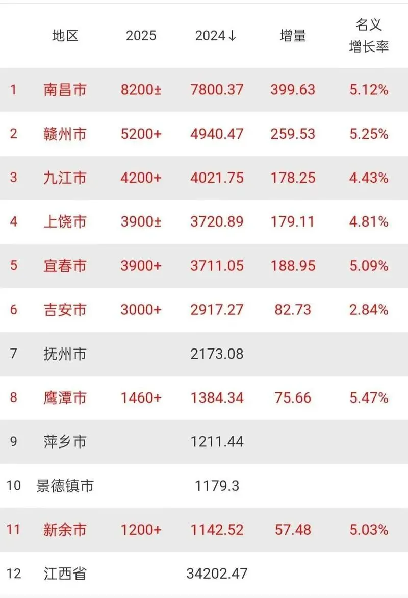 咱们先来看看老大哥南昌的成绩单。2025年南昌的GDP稳稳跨过了8100亿的大关,拿下了8141.69亿元的好成绩。放在全国的盘子里看,南昌排在第37位,一年下来的经济增量也超过了330亿。
