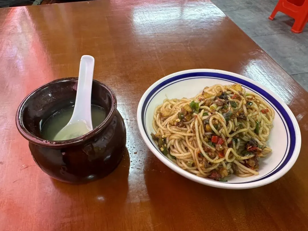 突然一阵饥饿感,出景区北门左转,一家不起眼的小饭馆,普普通通的拌粉和瓦罐汤,只要十元,吃得很满足。