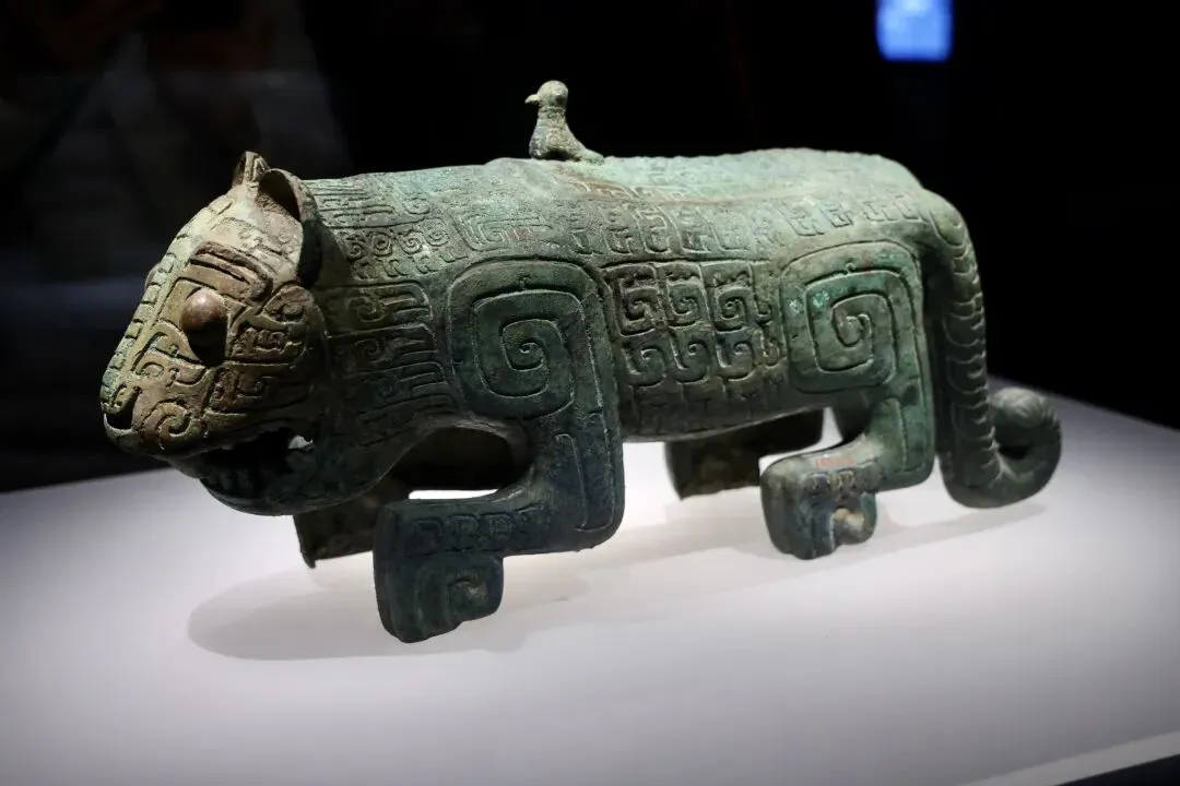 “虎踞江南——新干大墓与青铜王国”常设展中的商代伏鸟双尾青铜虎。