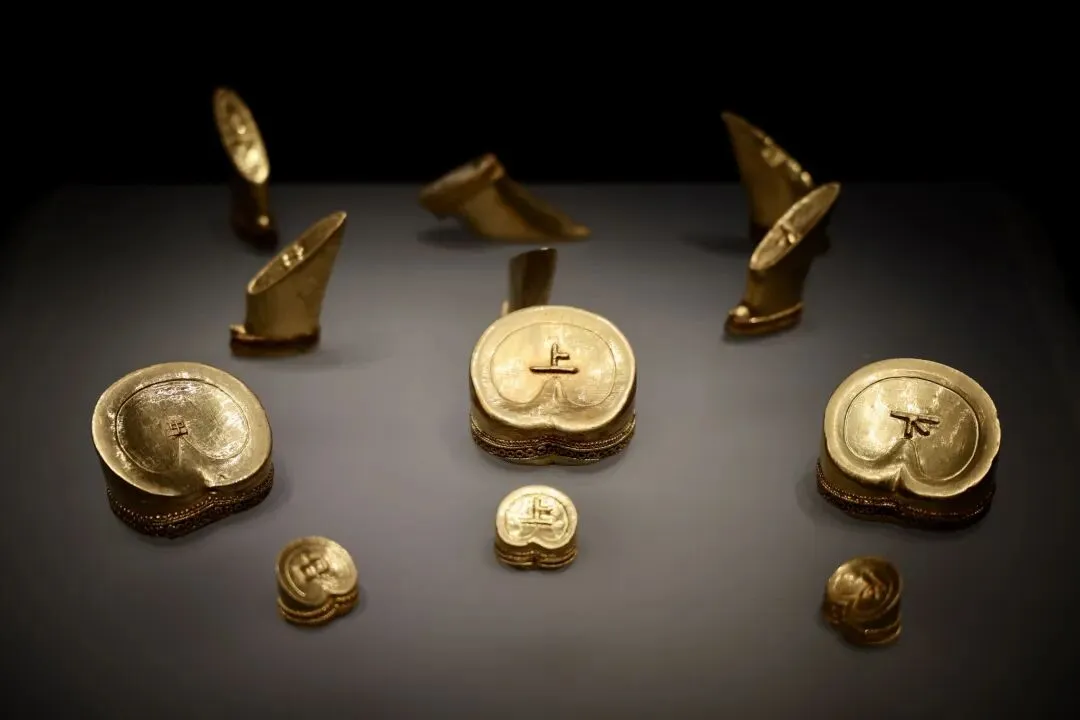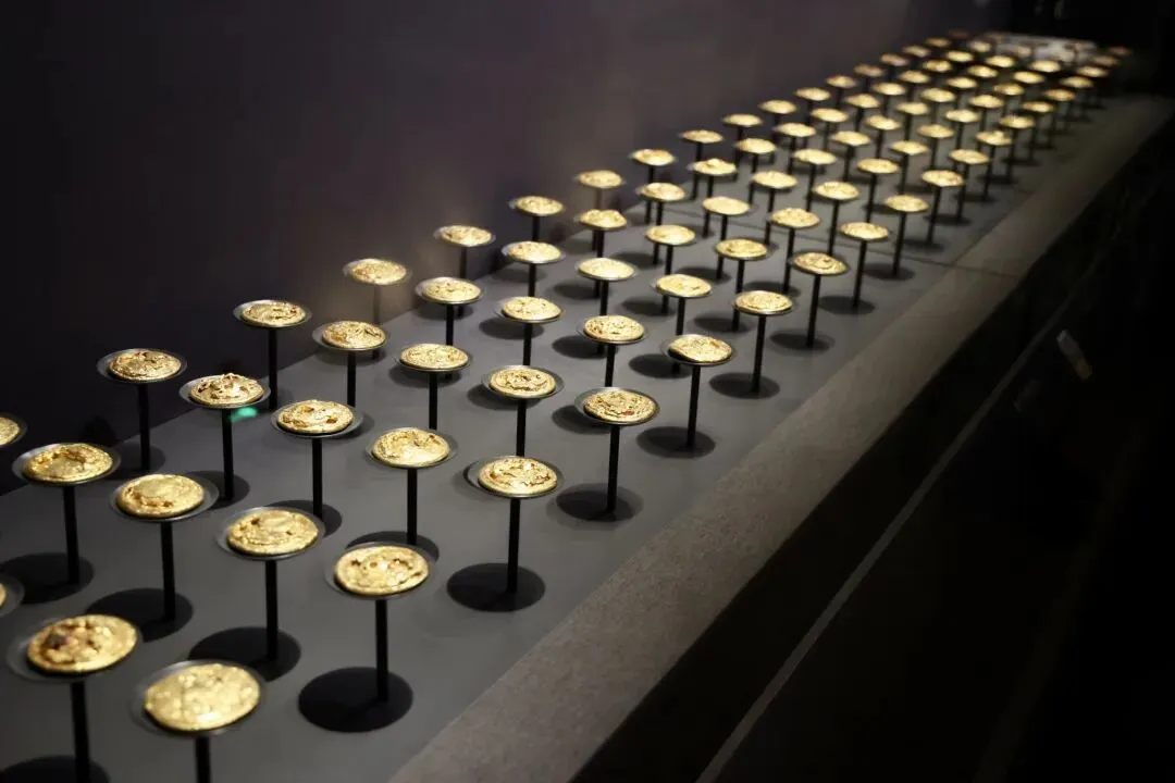 “金色海昏——汉代海昏侯国历史陈列展”。内棺底部陪葬的金饼,垫在包金丝缕琉璃席下面。