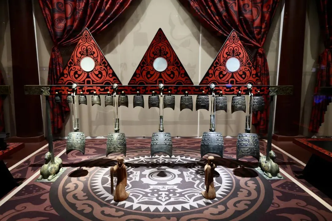 刘贺墓出土的青铜编甬钟和鎏金青铜钮钟。