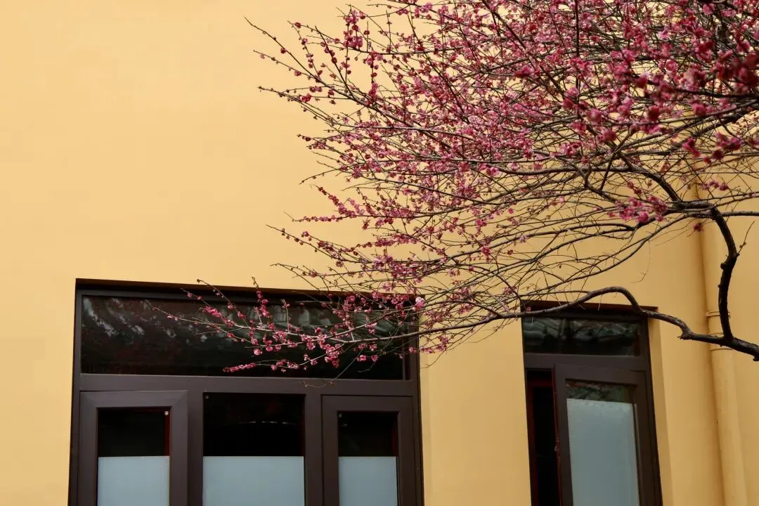 黄墙配红梅,想象中寺庙该有的样子。