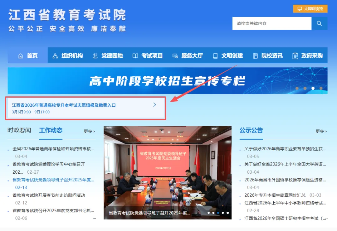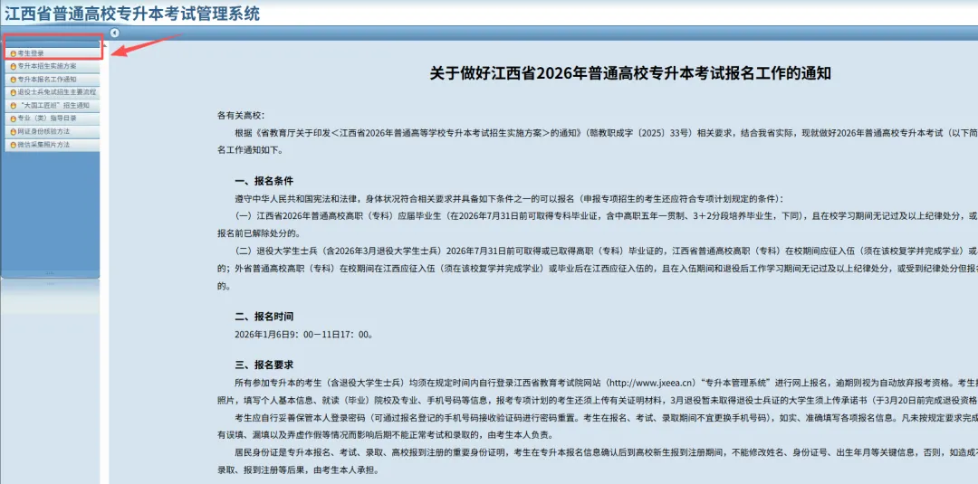 1.登录江西省教育考试院网站(www.jxeea.cn),点击首页“江西省2026年普通高校专升本系统入口”,进入“江西省普通高校专升本考试网上报名系统”。