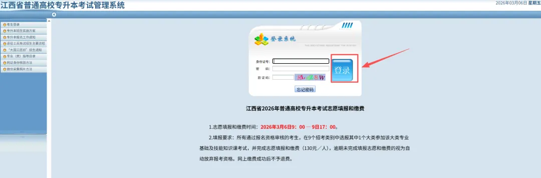 2.在“江西省普通高校专升本考试网上报名系统”左侧任务栏点击“考生登录”,进入登录页面。
