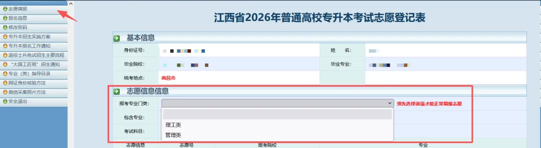 4.点击左侧任务栏中的“填报志愿”,进入志愿填报页面,选择需要报考的专业门类(只能选择1个报考专业门类)。
