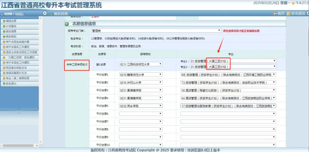 4.2“大国工匠计划”批次志愿填报。限具有大国工匠计划资格且已通过资格审核的考生填报。设置1个院校志愿,每个院校志愿后设置2个专业志愿。