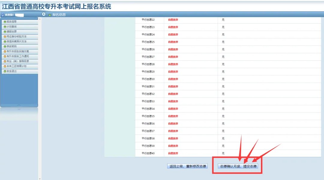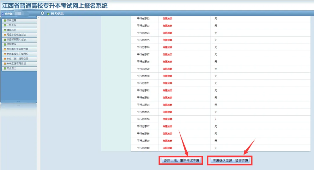 7.若志愿需要修改,可点击“返回上一级,重新修改志愿”。若确认志愿填报无误,则点击“志愿确认无误,提交志愿”。