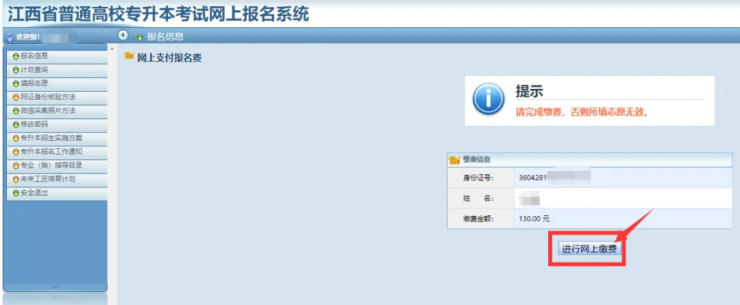 9.志愿提交成功,进入网上缴费环节。核对缴费信息无误后,点击“进行网上缴费”,系统弹框提示“是否确定进行网上缴费”,点击“确定”跳转至缴费页面。