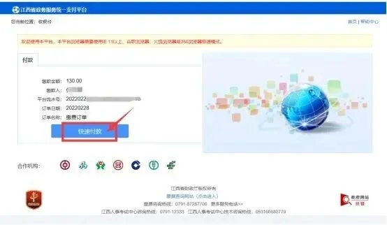 10.在“江西省政务服务统一支付平台”点击“快速付款”,并按操作提示完成缴费。