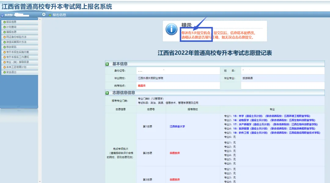 12.在查看志愿确认表页面,检查所填志愿是否需要修改,此页面提示还有1次提交志愿的机会。