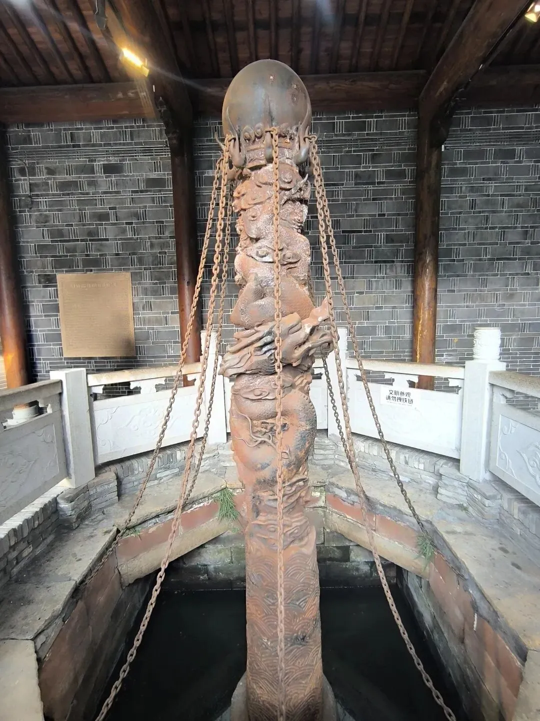 传说,许逊与众弟子历尽千辛万苦擒住兴风作浪的孽龙后,许逊把孽龙牵回南昌西山,锁在逍遥山静明坛的一口八角井里,称“铁链锁蛟”井,这只蛟龙在井里并不安分,头在西山,一条尾巴却伸到豫章城里,搅得百姓不得安宁。许逊于西晋永嘉八年(312)又在广润门铸了一口铁柱井,称“铁柱锁蛟”井,下面还安置了八根铁链,锁住龙尾,以镇地脉,并作祷祝词和谶语:“铁柱镇洪州,万年永不休;八锁钩地脉,一泓通江流。天下大乱,此地无忧。天下大是,此地薄收;地胜人心善,应不出奸谋,纵有好谋者,终领不到头。