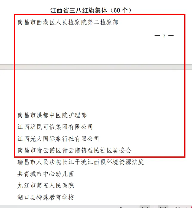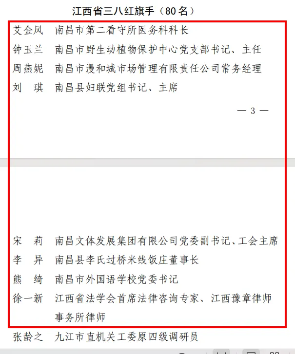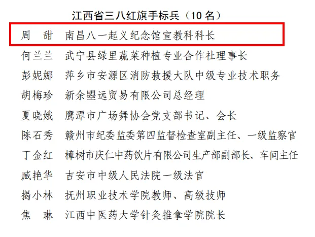 为表彰先进、树立榜样, 充分发挥先进典型和模范人物示范作用, 江西省妇联决定, 授予周甜等10人全省三八红旗手标兵称号, 授予艾金凤等80人全省三八红旗手称号, 授予南昌市西湖区人民检察院第二检察部等60个单位全省三八红旗集体称号。其中,南昌9名个人、5个集体上榜。