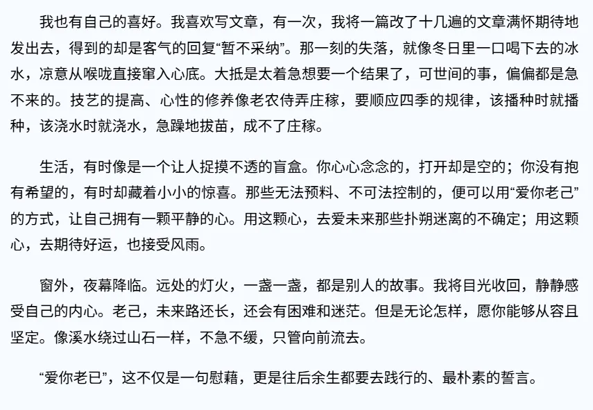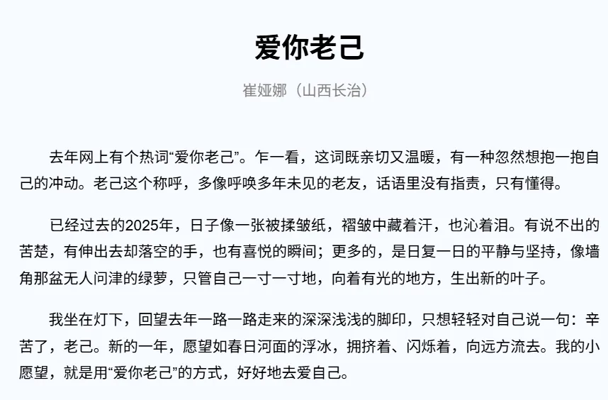 嗨,你好啊,我是梦馨,一个热爱文字的人。喜欢在烟火中捡拾温柔、在旧时光里收藏感动。爱你这个词不是一直都被用在别人身上吗?比如爱你老妈、爱你老爸、爱你老伴、爱你老同学......于是,我对着镜子,看着自己这张饱经风霜的脸,双手抱了抱自己,将想对自己说的话写了出来,今天分享给大家,2026年愿各位朋友依然“爱你老己”。在AI盛行的时代里,真诚就是写作者最好的护城河。
