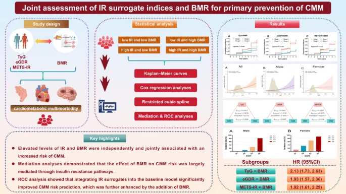 本研究证实,IR替代指数和BMR独立且联合预测CMM风险,BMR显著介导BMR与CMM的关联,二者联合评估可改善风险分层,为CMM一级预防提供新策略。