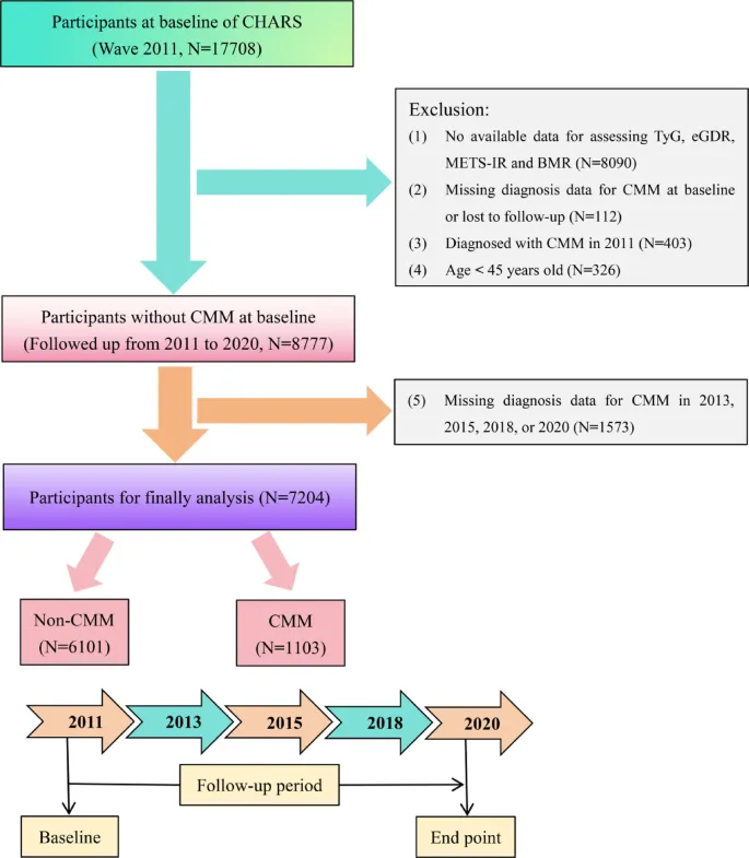 数据筛选:从CHARLS 2011-2020年数据中,筛选7204名参与者,提取IR指数(TyG、eGDR、METS-IR)、BMR及CMM状态。