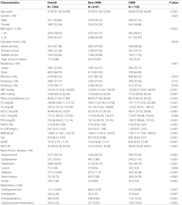 📈本研究纳入 7204 名参与者,随访 9.0 年,1103 人(15.3%)发生 CMM。CMM 组年龄更大、代谢指标更差,慢病患病率更高,且 TyG、METS‑IR、BMR 更高,eGDR 更低(均 P<0.05)。表1