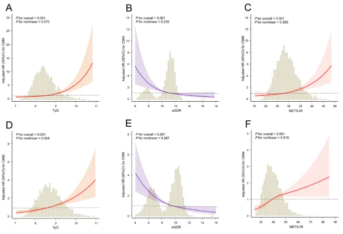 📈校正后,BMR、TyG、METS‑IR 升高增加 CMM 风险,eGDR 升高降低风险;联合分析显示,高 IR + 高 BMR 组发病率最高,敏感性分析证实关联稳健(METS‑IR 除外)。图2