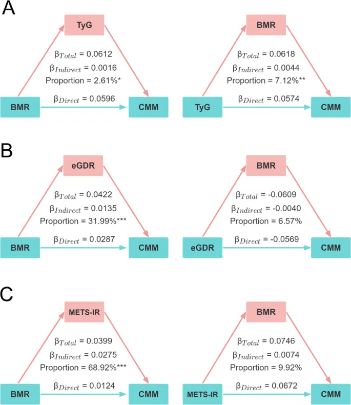 双向介导机制:揭示 BMR 与 CMM 的关联主要由胰岛素抵抗通路介导,而 TyG 与 CMM 无显著双向介导,为机制研究提供新视角。