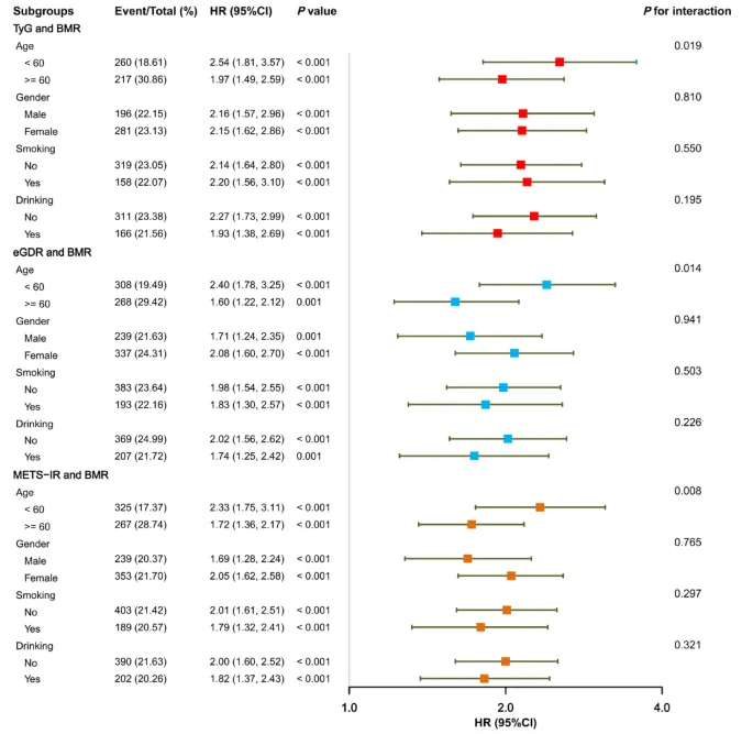 📈Cox 回归显示,校正后高 IR 联合高 BMR 者 CMM 风险最高,其中高 TyG + 高 BMR(HR=2.13)、低 eGDR + 高 BMR(HR=1.93)、高 METS‑IR + 高 BMR(HR=1.92)均显著升高。表2