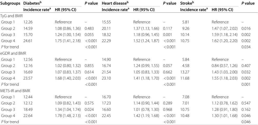 表3: 介入放射替代指标与基础代谢率(BMR)对糖尿病、心脏病和中风风险联合影响的敏感性分析(n = 5237)