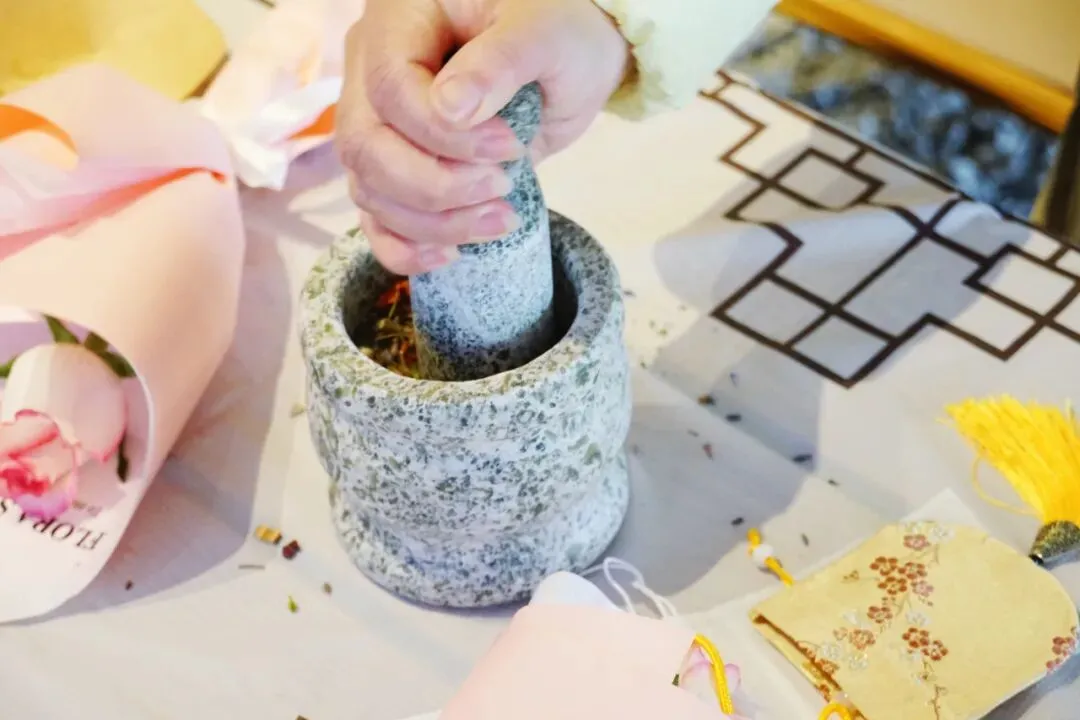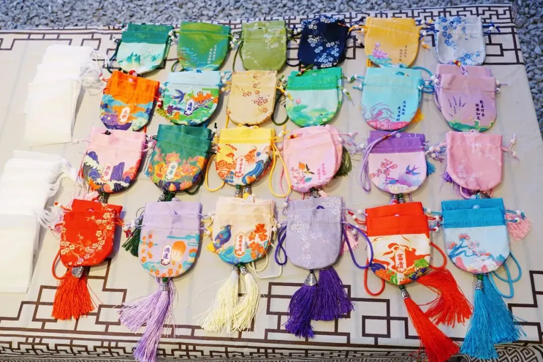此外,本次活动还为大家备好色彩鲜艳的布料、紫苏艾草等天然香料,以及针线、流苏、挂绳等制作材料,并邀请专业手工老师现场授课指导。老师用通俗的语言讲解香囊的文化寓意,从布料对折、穿针引线,到填充香料、收口打结,对每一个制作环节都耐心示范、细致讲解,让大家轻松掌握制作技巧。