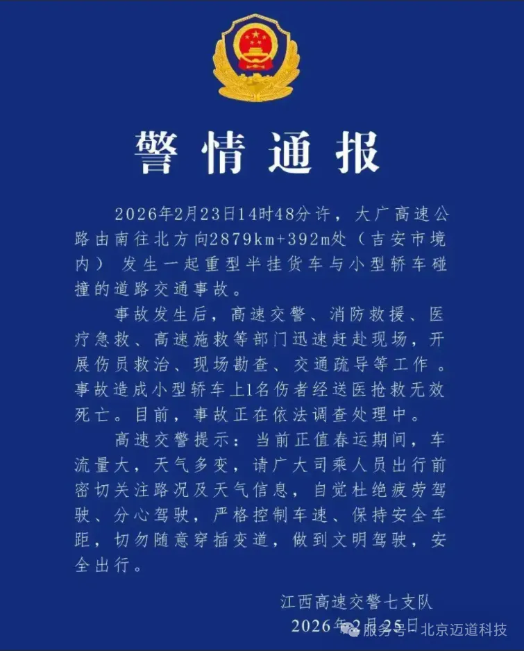 2026年2月24日(农历正月初七,返程高峰),南昌这户家庭自驾返程,车上是夫妻俩和三个未成年孩子。行至高速南昌相关路段(具体位置以官方通报为准)时,小轿车被重型货车挤到护栏,撞得面目全非,右侧凹陷、结构损毁,现场十分揪心。