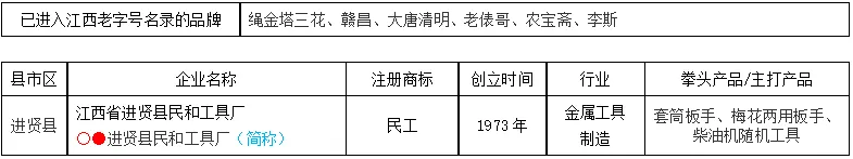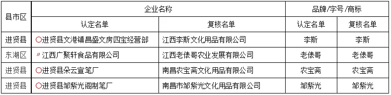 首批(2014年12月28日)公布19个,含中华老字号5个,江西老字号5个,未列入复核名单1个,现有8个。第二批(2015年12月22日)公布4个,含江西老字号2个,未列入复核名单2个。第三批(2016年11月25日)公布7个,江西老字号6个。第四批(2017年12月19日)公布7个(附条件通过1个),含中华老字号1个,江西老字号4个。