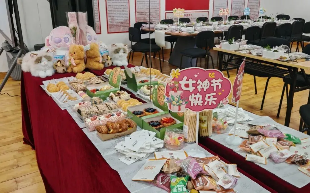 活动当天,清新的造景元素错落有致,鲜花与点心静静摆放,空气中弥漫着草木芬芳与甜蜜气息,营造出满满的节日氛围。