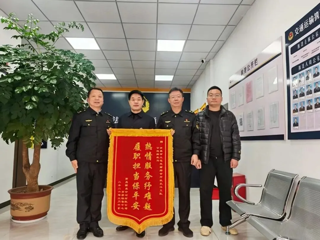 3月6日下午,南昌赣昌砂石有限公司高新销售中心负责人将一面印有 “热情服务纾难题 履职担当保平安”的锦旗送到支队公路路政科,对该科精准帮扶企业解决治超平台数据上传难题、助力企业安全生产表示衷心感谢。