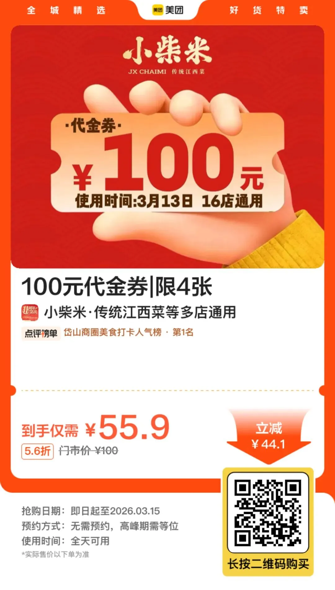 >南昌16店通用「小柴米·传统江西菜」优惠券:55抵100可叠加