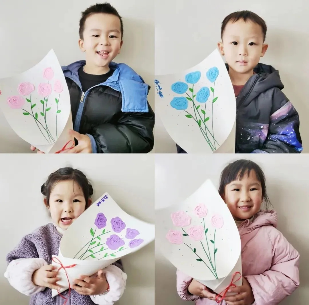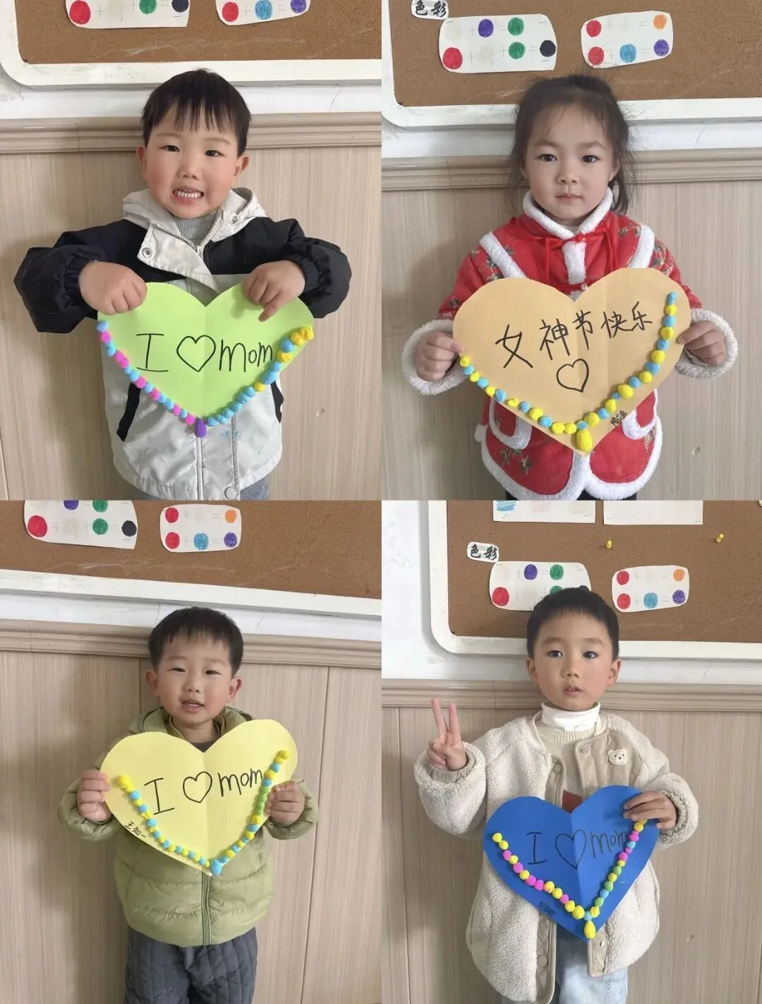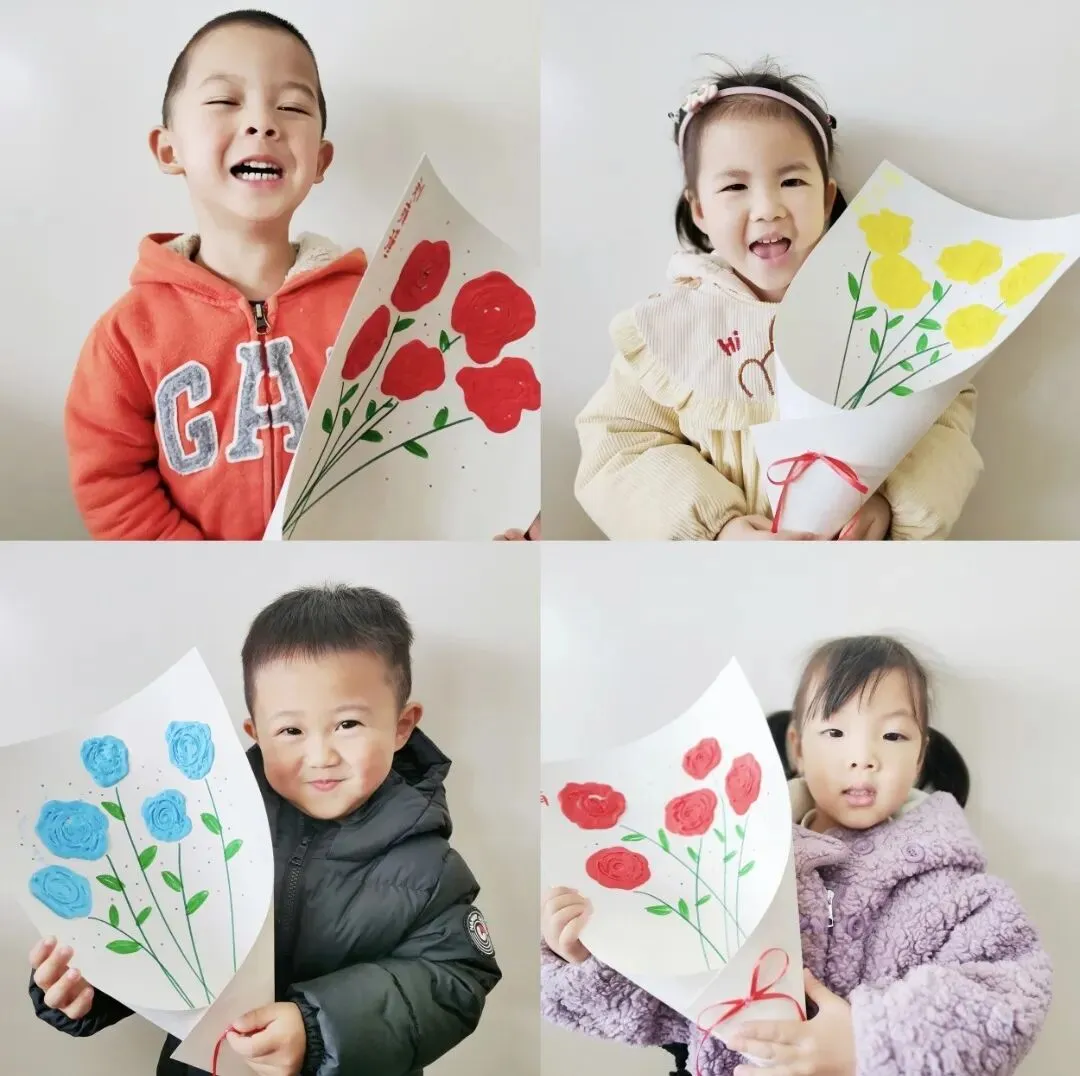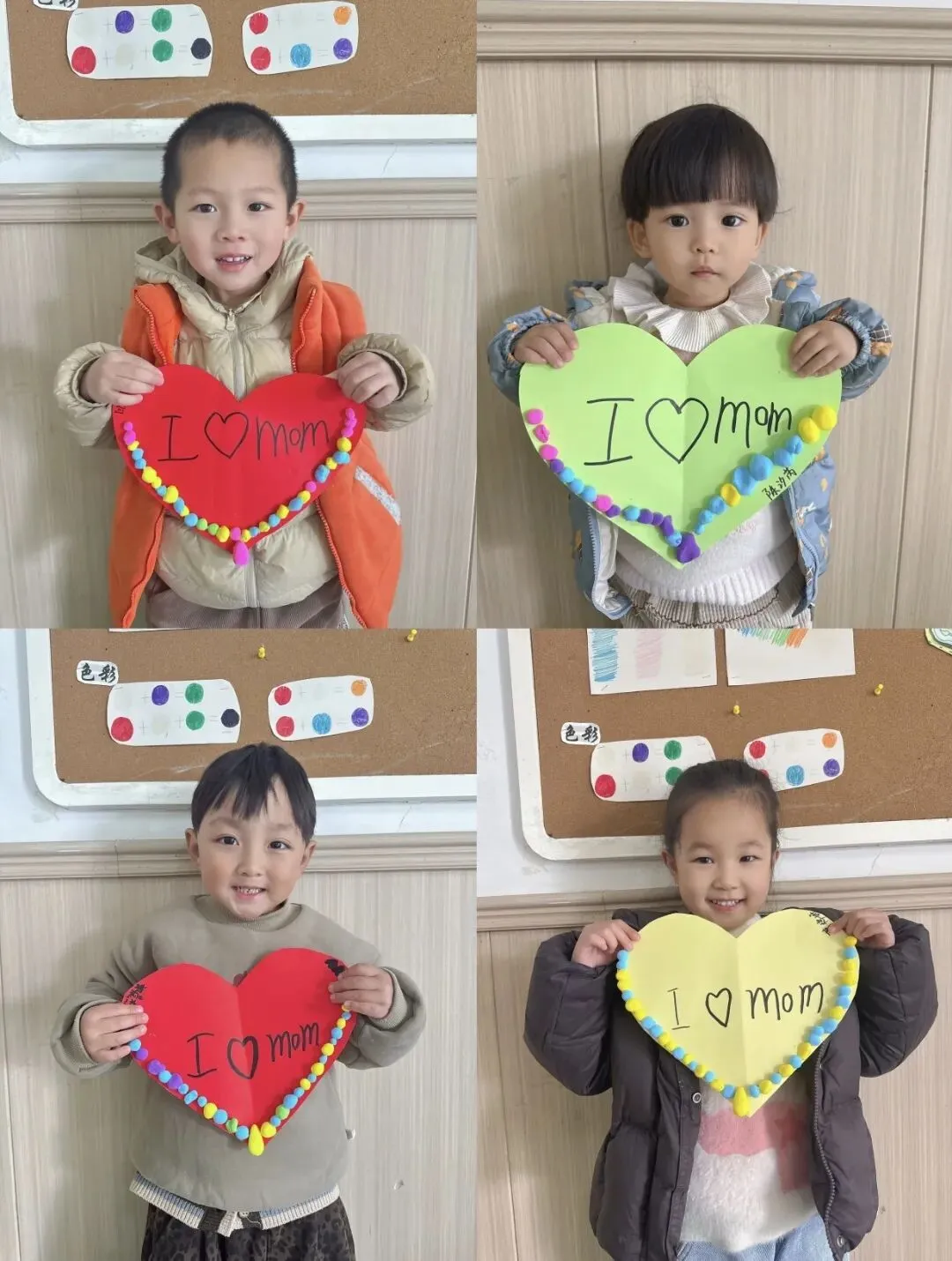 了解了节日的意义后,孩子们迫不及待地化身“小小艺术家”,用稚嫩的双手为心中的“女神”制作独一无二的礼物。各班级活动室里热闹非凡,彩纸、黏土、画笔、纽扣在小手中翻飞。托小班的宝贝们用指纹点画了娇艳的康乃馨;中大班的孩子们则精心设计了立体贺卡、爱心钥匙扣和“爱的奖杯”。每一个褶皱都折得认真,每一笔色彩都涂得用心。孩子们将满满的爱意融入作品,悄悄许下心愿:“妈妈,我永远爱你!”“奶奶,您辛苦了!”