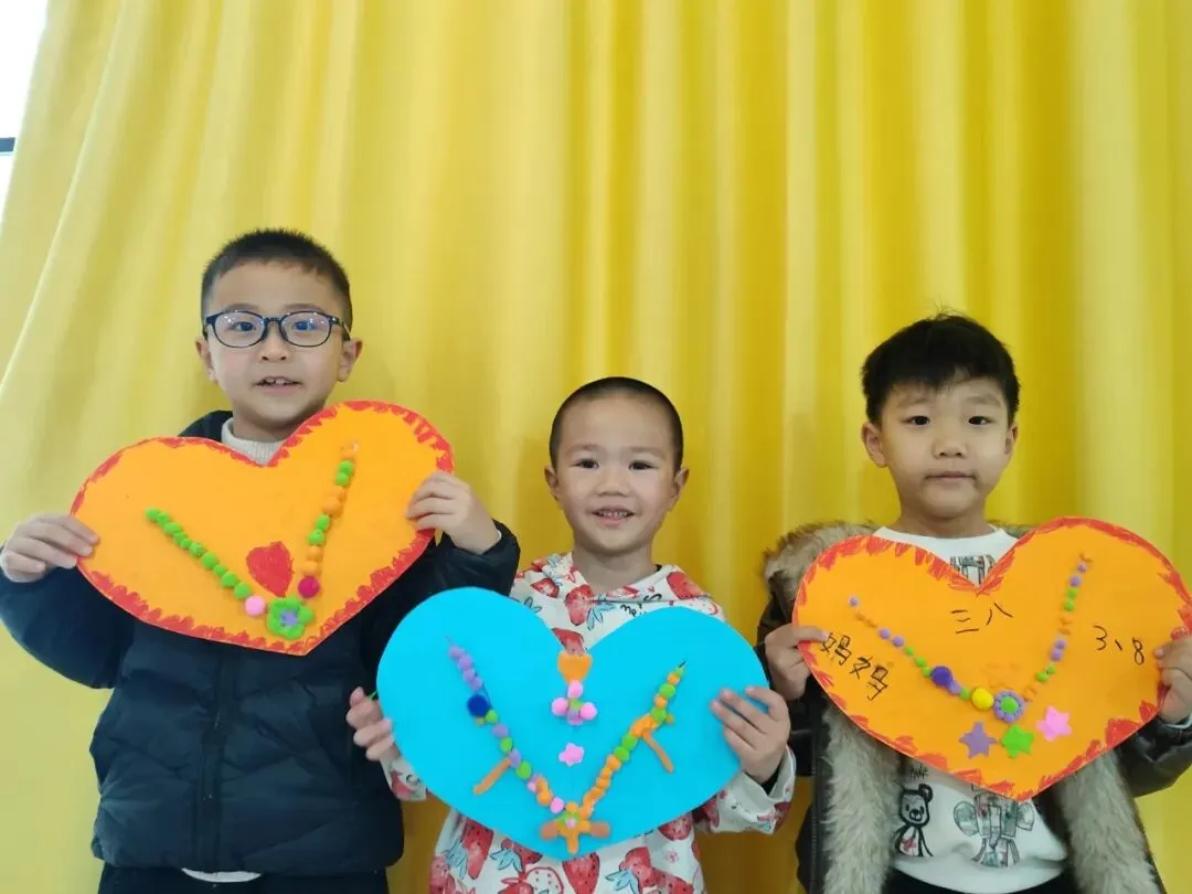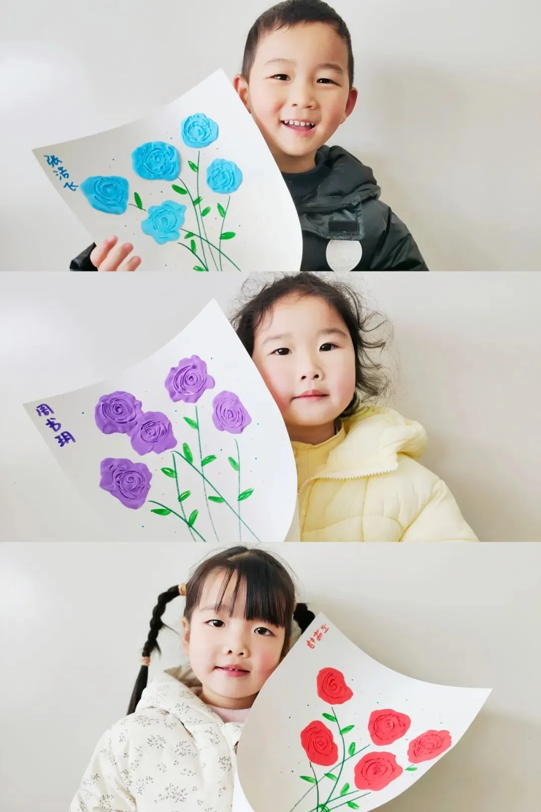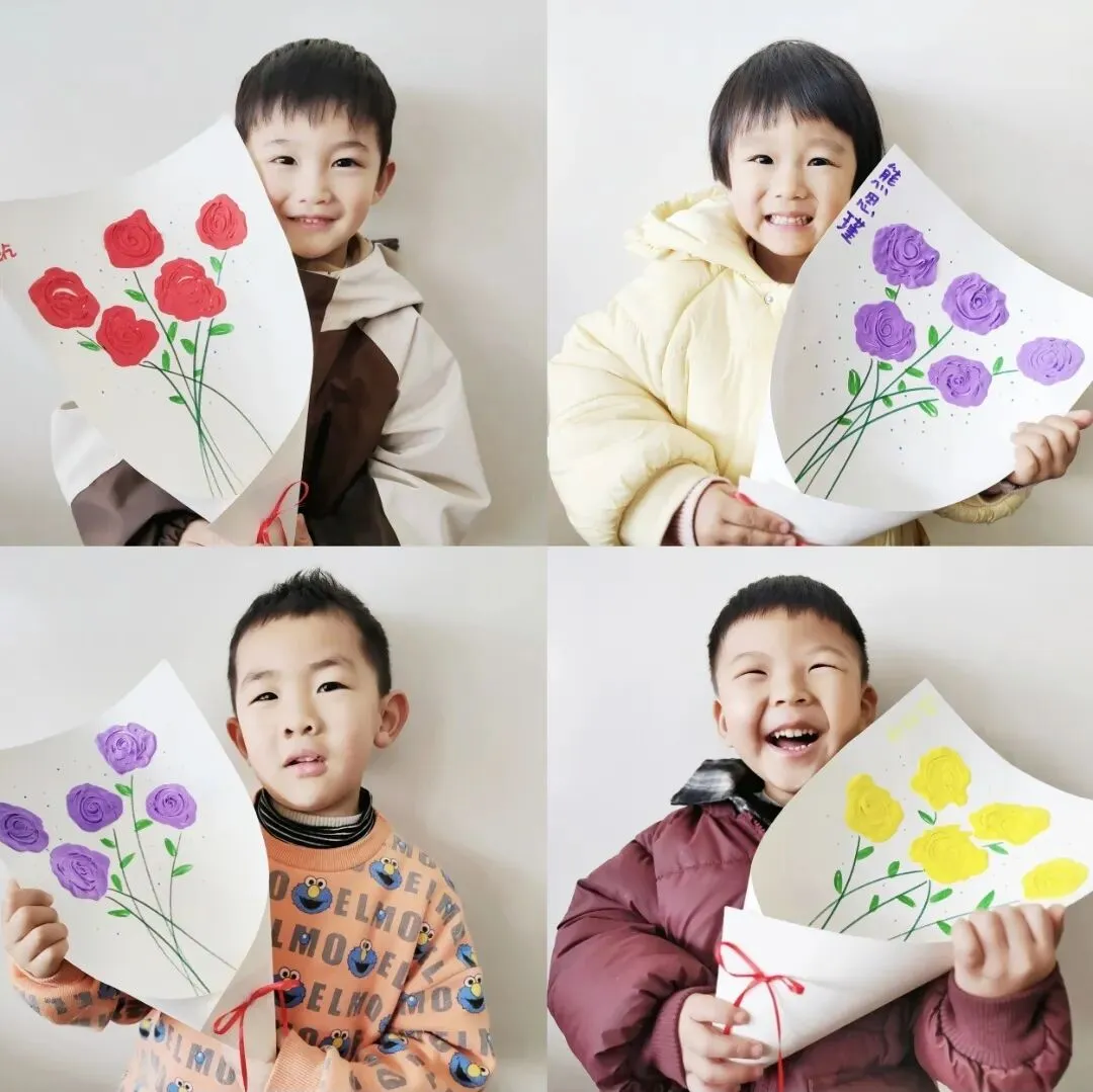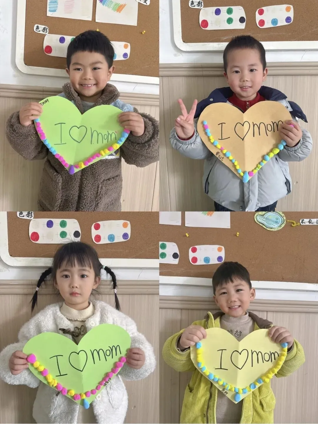 了解了节日的意义后,孩子们迫不及待地化身“小小艺术家”,用稚嫩的双手为心中的“女神”制作独一无二的礼物。各班级活动室里热闹非凡,彩纸、黏土、画笔、纽扣在小手中翻飞。托小班的宝贝们用指纹点画了娇艳的康乃馨;中大班的孩子们则精心设计了立体贺卡、爱心钥匙扣和“爱的奖杯”。每一个褶皱都折得认真,每一笔色彩都涂得用心。孩子们将满满的爱意融入作品,悄悄许下心愿:“妈妈,我永远爱你!”“奶奶,您辛苦了!”