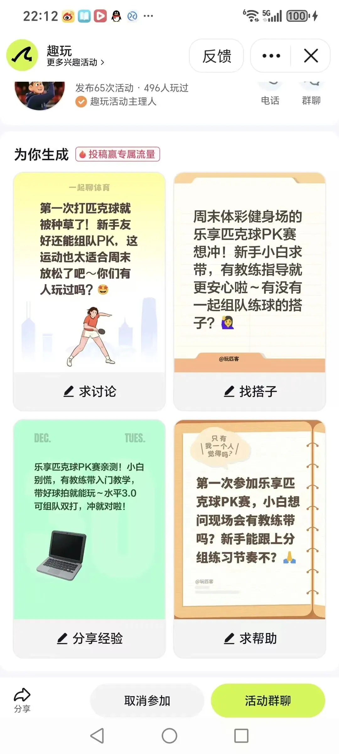 报名我们通过的抖音「趣玩」发起的匹克球活动后 用AI一键生成活动文案(求讨论/找搭子/经验分享/求助)的活动投稿。能快速引流,快来体验超省心的投稿神器~