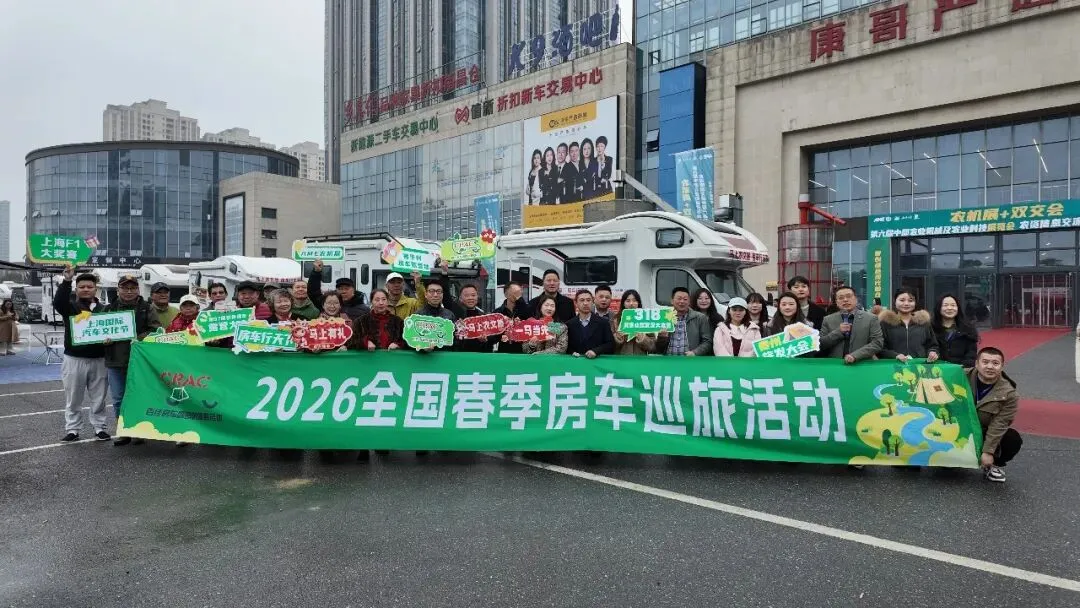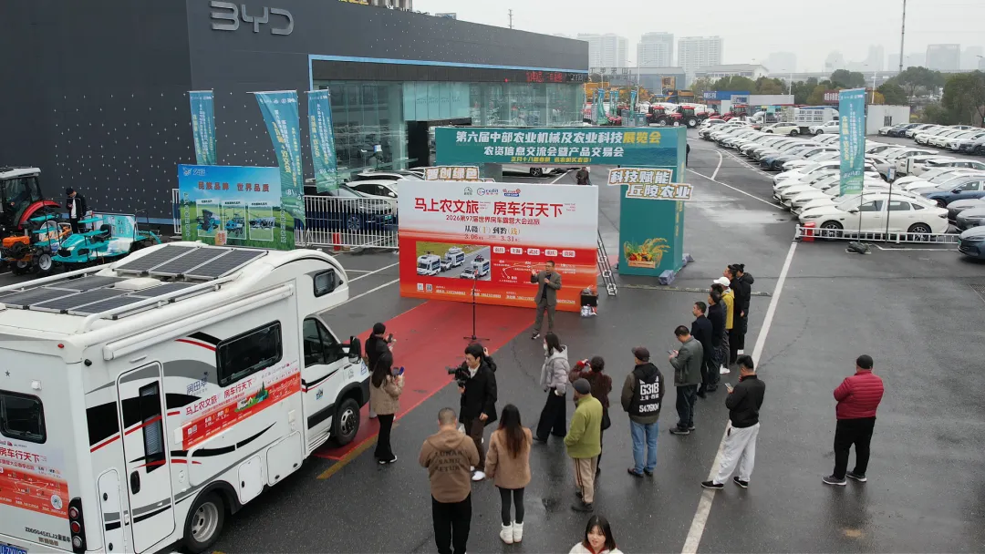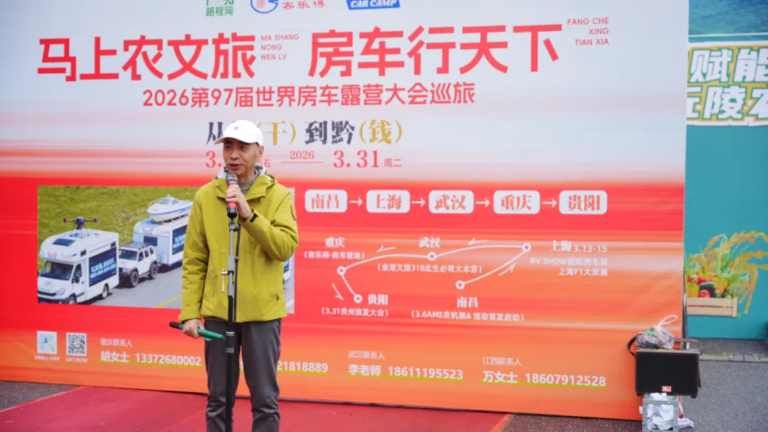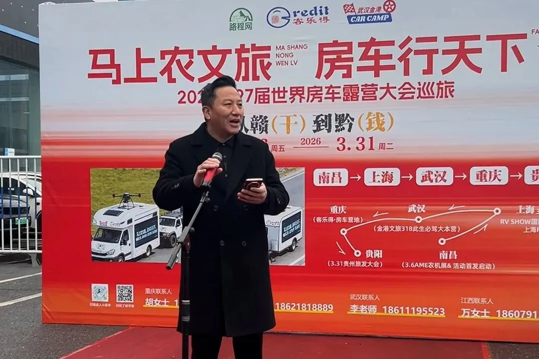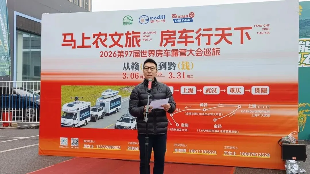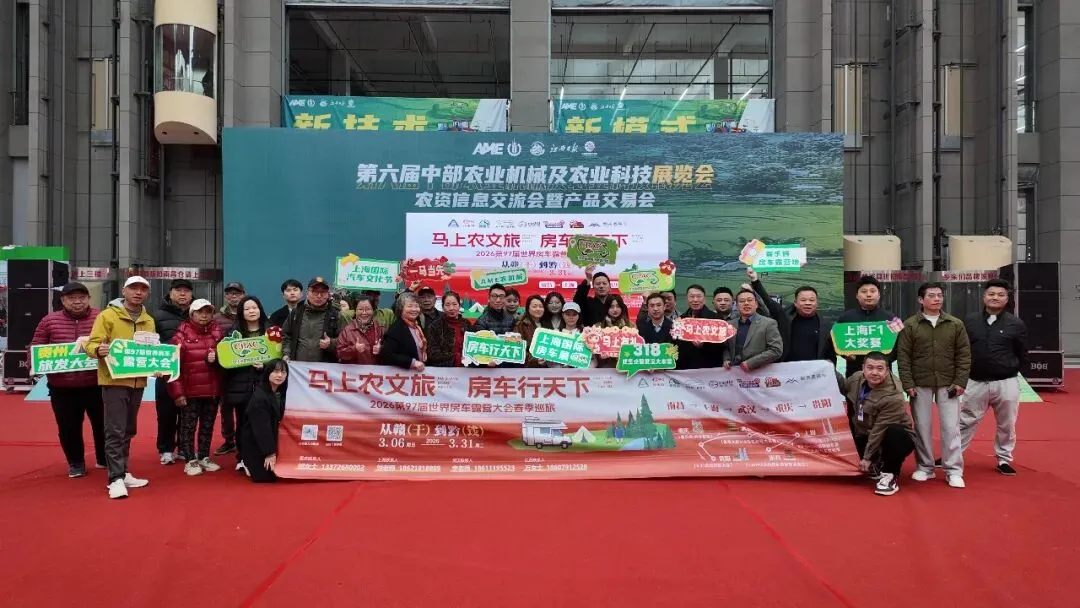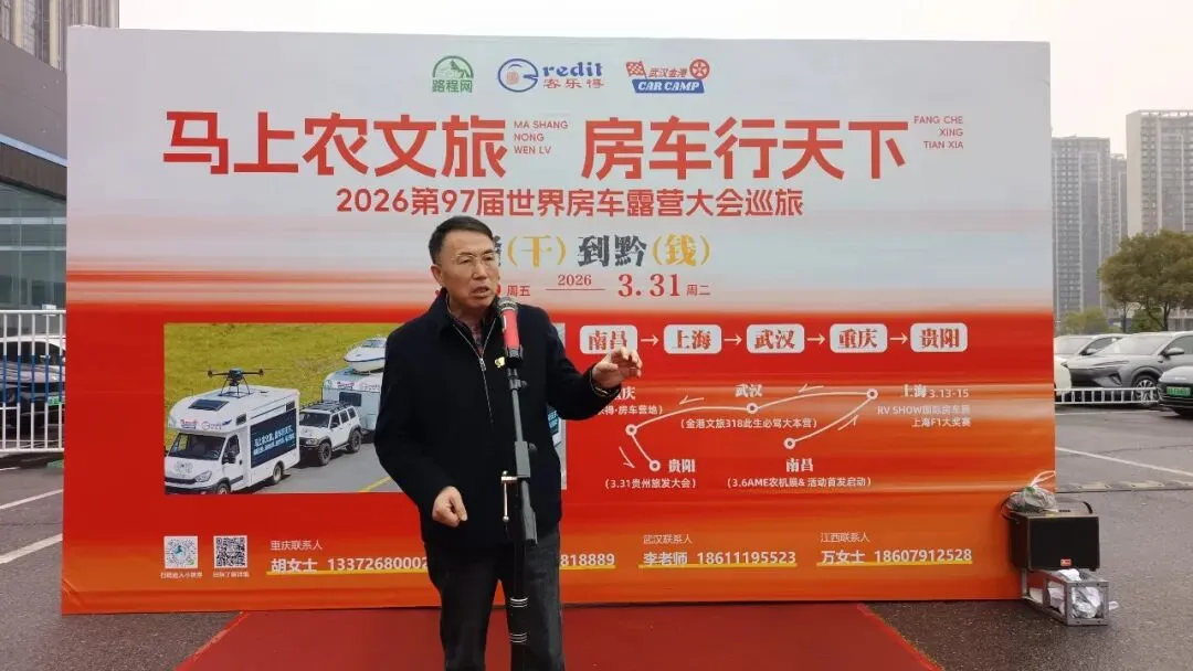 随后,马上农文旅房车行天下共同发起人、武汉金港文旅发展有限公司董事长、“此生必驾 318”武汉大本营创始人黄亚林正式宣布马上农文旅・房车行天下|2026 马年春季房车巡旅正式开启。嘉宾们依次挥动旗帜,在发车号角声中,一辆辆房车鸣笛出发,正式踏上从赣到黔、贯穿五省市的农文旅融合新征程,一路传播乡村振兴风采、展现大美中国风光。本次南昌站作为巡旅首站,深度参与第六届中部农业机械及农业科技展览会,并结合直播等特色活动,开启巡旅首站的农技推广与产销联动实践。由12台房车组成的车队从英雄城南昌出发,将一路横跨赣、浙、苏、鄂、渝、黔多省市,沿途将根据资源对接与营地合作进展动态优化路线,以“移动直播 + 场景带货” 为核心模式,串联各地优质农文旅节点,实现 “边走边播、所见即所得”。巡旅第二站将抵达上海,于 3 月 13 日至 15 日,深度联动在上海汽车会展中心举办的第 25 届上海国际房车展。车队将亮相展会现场,深入探访并参与同期举办的 AUTO SHOW 上海国际潮车文化节,沉浸式感受“房车 + 潮车”跨界融合的全新汽车文化氛围。本次春季房车巡路由上海国际房车露营博览会组委会发起,并联合第97届F.I.C.C.世界房车露营大会组委会、百佳房车露营创新联合体(筹)共同举办。活动积极响应 2026 年中央一号文件 “深化农文旅融合、全面推进乡村振兴” 战略部署,采用“移动直播 + 场景带货” 模式,深度串联沿线优质农业、文化与旅游资源,搭建跨区域、多元化产业联动平台。通过房车露营产业与农业现代化、文旅产业化深度融合,畅通农产品上行通道,助力乡村振兴战略落地见效,推动农文旅产业高质量发展。本次巡旅不仅是一场房车爱好者的集结,更是一次农文旅融合发展的创新实践。我们期待,在接下来的上海站、武汉站、重庆站、贵州站,能够见证更多精彩瞬间,收获更多合作硕果。也欢迎沿途各界朋友关注车队动态,共同参与这场“边走边播、所见即所得”的沉浸式巡旅,一起感受房车生活的无限可能,共同书写乡村振兴的时代篇章。···END···