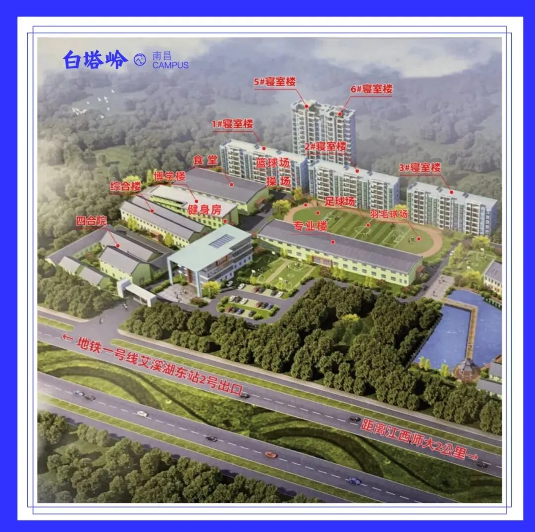 白塔岭南昌校区坐落于南昌市高新区紫阳大道18号,地理位置优越,位于高新区教育高地,紧邻江西师范大学等多所高等学府。