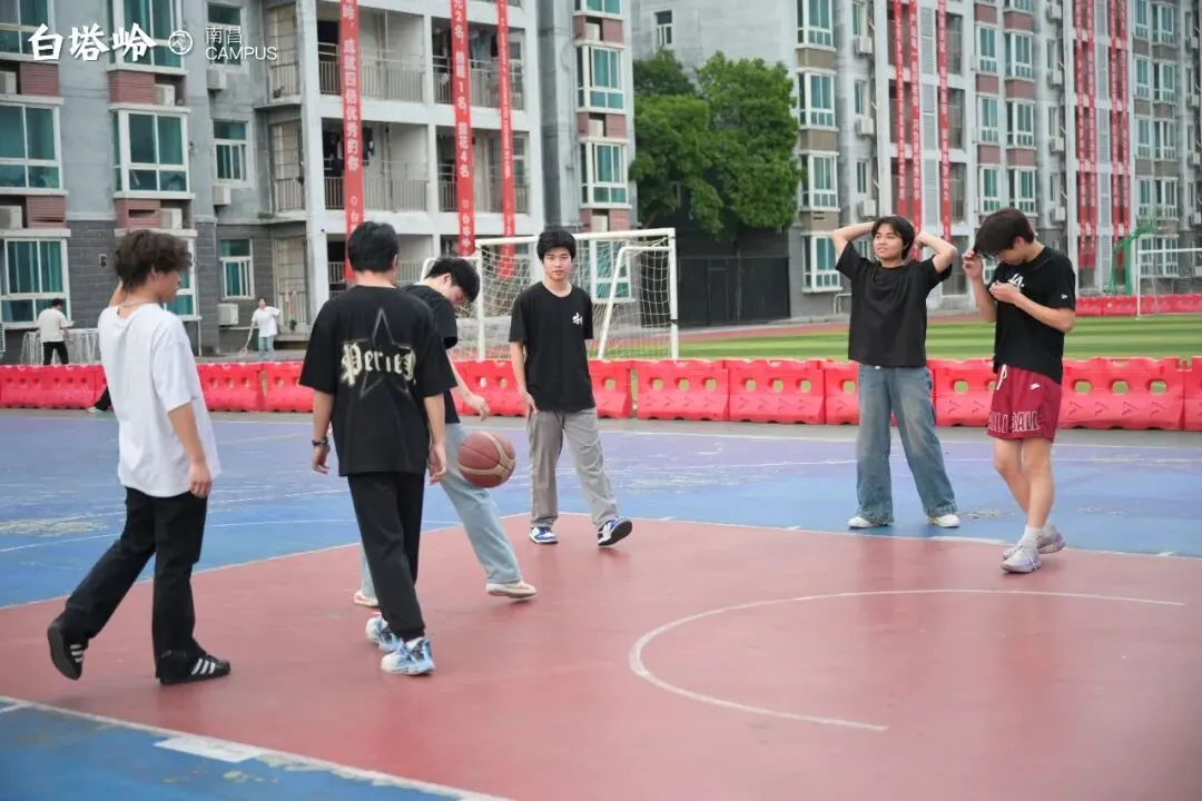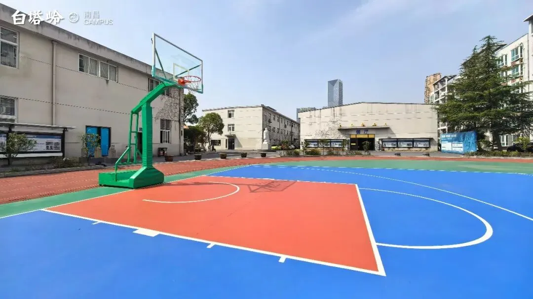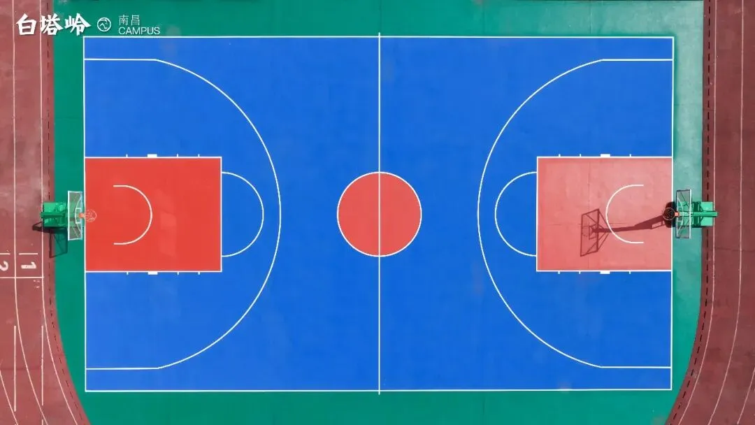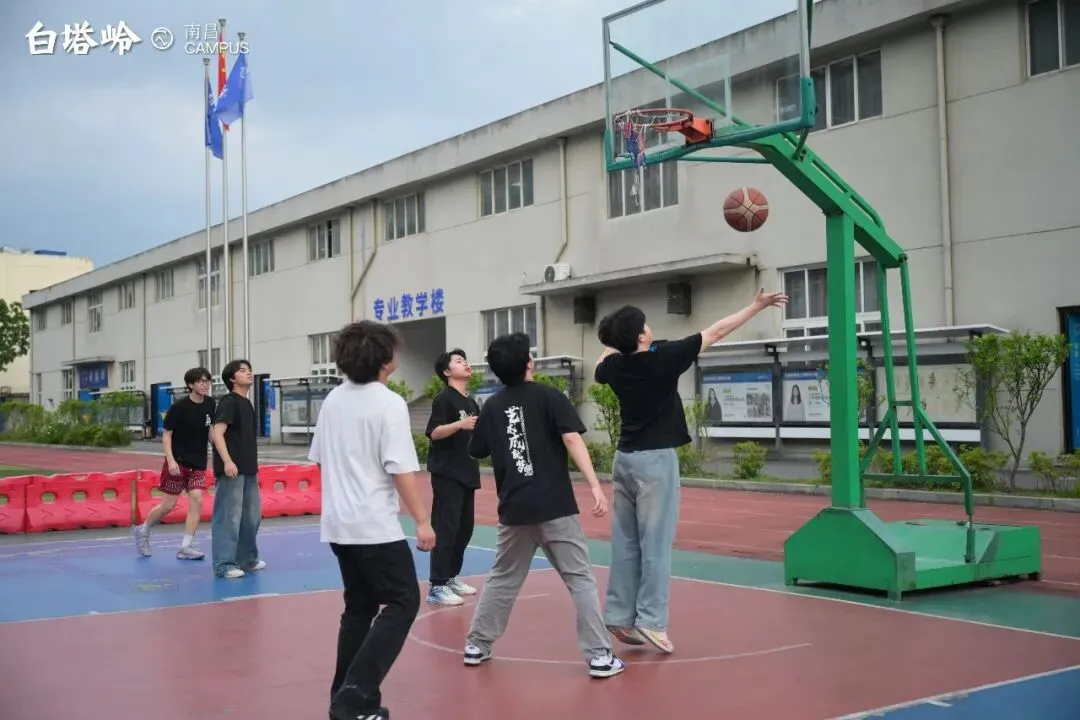 没有什么地方能比这里更适合进行室外有氧运动了。健康的体魄、愉悦的心情是同学们学习进步、快乐成长的润滑剂。球场开阔,红蓝相间的地面在阳光下格外鲜明。少年们在此奔跑、投篮、挥洒汗水,运球声与笑语交织,是青春最生动的节奏。这里不仅是释放压力的地方,也是灵感与默契生长的角落。每一次传球是信任,每一次突破是勇气。当带着一身畅快回到画架前,笔尖仿佛也多了几分果敢与自由。