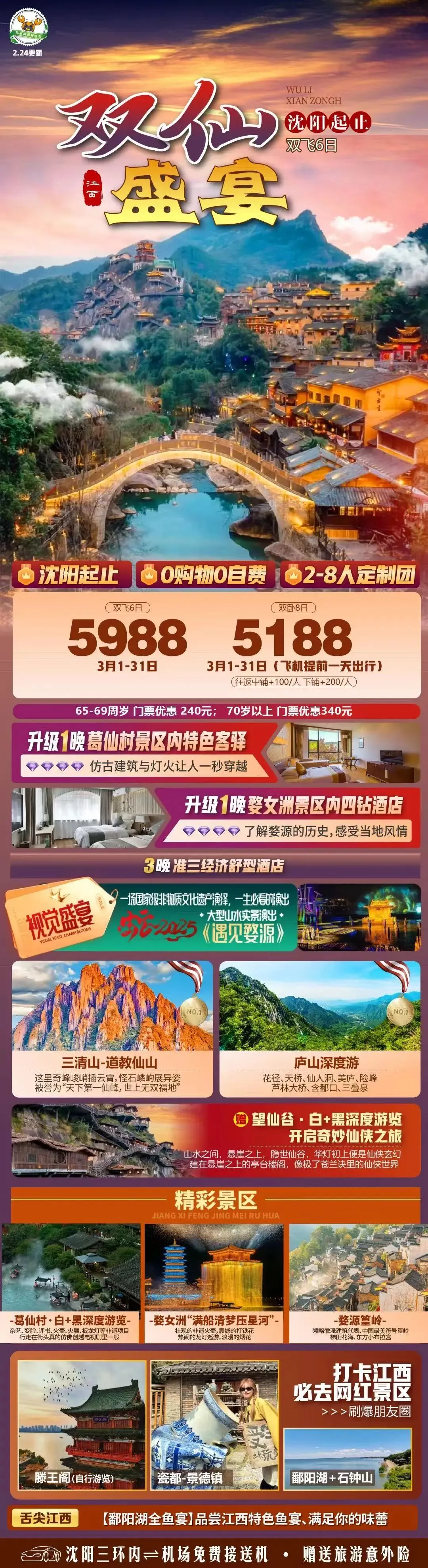 07:00-07:50早餐 07:50-09:50乘车前往世界文化遗产景观-庐山(庐山索道往返120元/人需自理,庐山观光车70元 /人需自理); 09:50-10:20购票乘坐索道上庐山(缆车乘坐时间约10分钟) 10:20-12:30游览白居易草堂-【花径公园】(游览时间约30分钟);参观形如提琴的【如琴湖】、 【锦绣谷】(游览时间约1.5小时)、充满神秘色彩的-【天桥】、蒋介石与美国特使马歇尔秘密谈 判处谈判台毛主席诗中的“天生一个【仙人洞】、无限风光再【险峰】”;庐山保存最完好历史最悠 久的【御碑亭】、了解庐山佛教历史文化; 12:30-13:30自行安排中餐 13:30-17:00参观蒋介石与宋美龄曾居住的—【美庐别墅】(游览时间约45分钟)(每月第一周、 三周的星期三闭馆一天,星期六、星期天正常开放);召开庐山三次重要会议的-【庐山会议旧址】 (游览时间约45分钟)(每月第一周、三周的星期二闭馆一天,星期六星期天正常开放)【庐山博 物馆】也称芦林一号别墅,也叫毛泽东同志旧居,1961年,毛泽东二上庐山时,曾在此居住两个月, 也是毛泽东在庐山生活最长的一次,附近的庐林湖是毛泽东游泳的地方,【庐山诗碑园】(游览时间 约1小时)正式名称为毛泽东诗碑园,位于庐山芦林湖畔。 该园为纪念毛泽东同志诞辰一百周年而 修建,于1993年动工、1994年建成,是一座以诗歌为主题、融合园林艺术的纪念性建筑。【牯岭 镇街心公园】; 17:00-17:30乘坐索道下山 17:30-18:00乘车前往九江市区,前往酒店办理入住; 4钻/星参考酒店:(晨枫臻品、锦都龙荷、天海柏唐、美豪丽致或同级) |