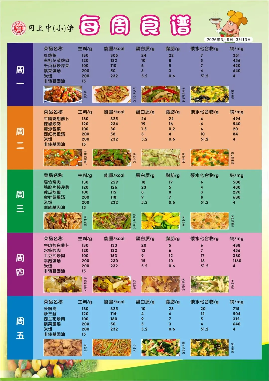 >南昌县冈上中学每周食谱公示(3月9日—3月13日)