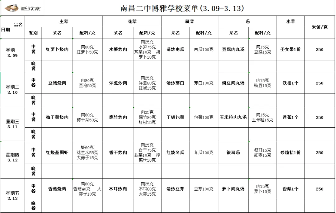 南昌二中九龙湖校区(博雅学校)一周菜谱(3.9—3.13)