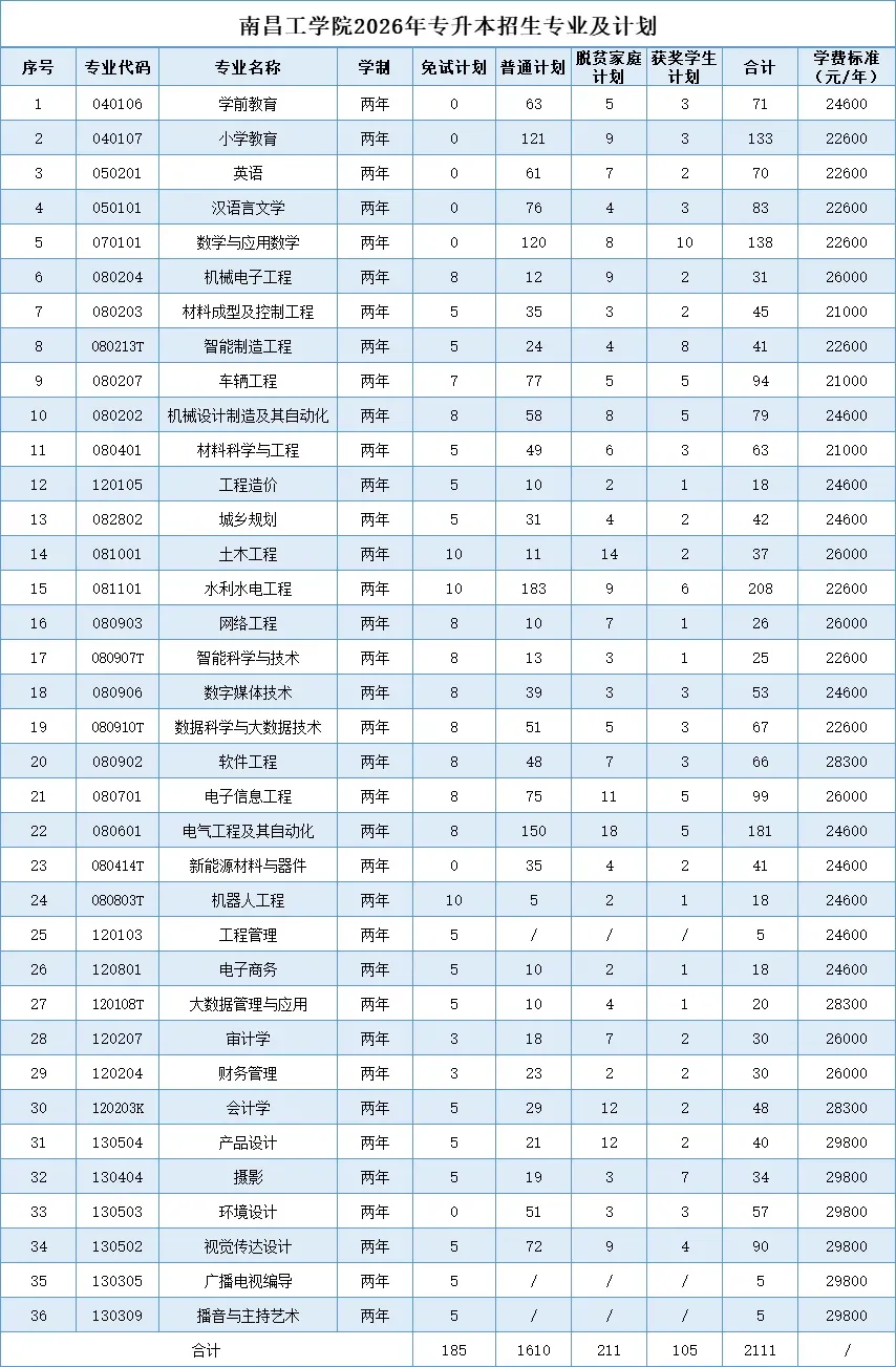 第十二条学校2026年专升本总招生计划2111人,按专业对口原则实施招生。专升本招生计划通过学校网站等形式向社会公布,各专业招生计划详见《2026年南昌工学院专升本招生专业计划表》。