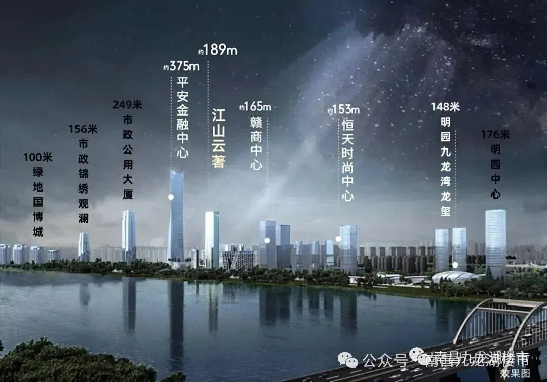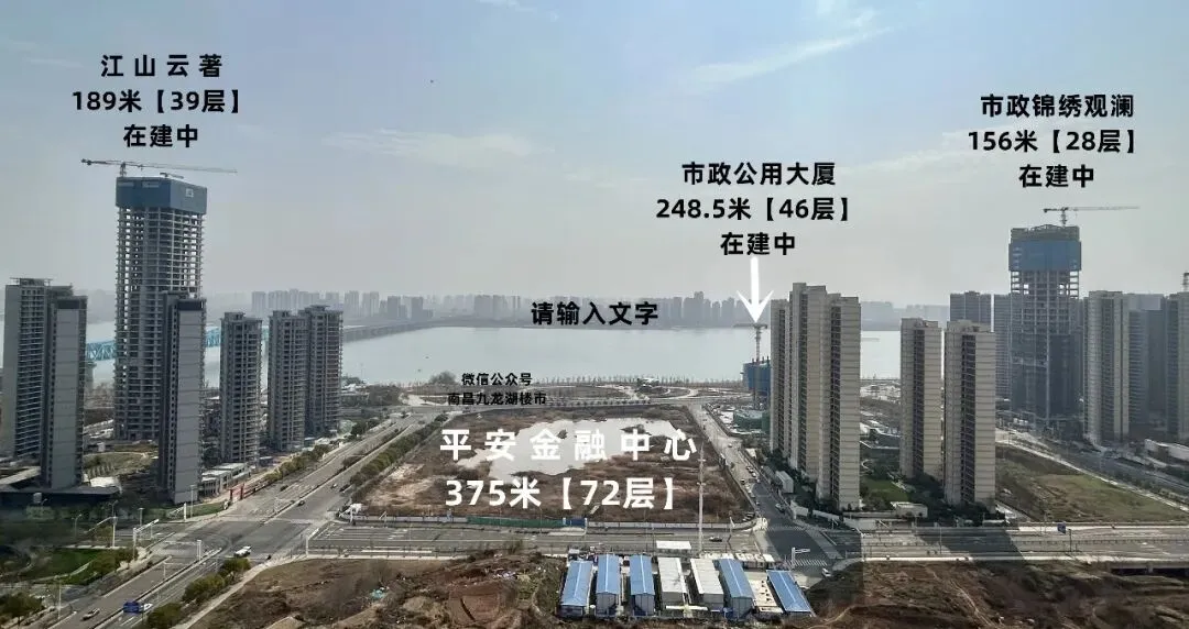 江西第一高楼375米的,平安金融中心,目前处于停工状态。江西第一高楼,375米的南昌平安国际金融中心(目前搁浅中)位于红谷滩区九龙湖的赣江南大道以西,龙兴大街以南,不远处是南昌地铁四号线安丰站,包含超高层办公楼,五星级酒店(凯悦酒店),10万方商业综合体等,塔楼总高度为72层,高度主体为375米!其中地下建筑共三层,第1层为办公、酒店大堂,2-3层为酒店配套,,5-14,16-34,36-45,47-56为办公,58-64,66-72层为酒店,其余为避难层!在顶部设置直升机坪。塔楼东侧设计为3层楼酒店配套裙楼,其中一层为酒店底层架空,2-3为酒店配套功能。此外,局部通过雨篷和塔楼连接。赣商中心,位于九龙湖的安丰街以南、赣江南大道以西,城运路以东,南洲街以北,163米(33层)占地57.2亩,为商业商务用地,容积率3.5,建筑密度40%;绿地率20%。总投资20个亿。目前,明园九龙湾商业体和酒店外立面已完工,内部还没装修。明园九龙湾商业综合体,位于九龙湖的三清山大道以西,九江街以北,定位为风潮指南,主要包括餐饮、零售、主力店、服务,共17个铺位。2F定位为精选生活,主要包括餐饮、零售、主力店、服务,共10个铺位。3F定位为趣致天地,主要包括餐饮、零售、主力店、服务,共17个铺位。4F定位为能量补给,主要为餐饮,零售,主力店,服务,共12个铺位。5F定位为乐活空间,主要为餐饮、零售,主力店,服务,共9个铺位。目前绿地国博城商业体,其中有一栋楼写字楼交付了,其他二栋楼和商业体还没交付,另外的商业办公用地已调整为住宅用地。