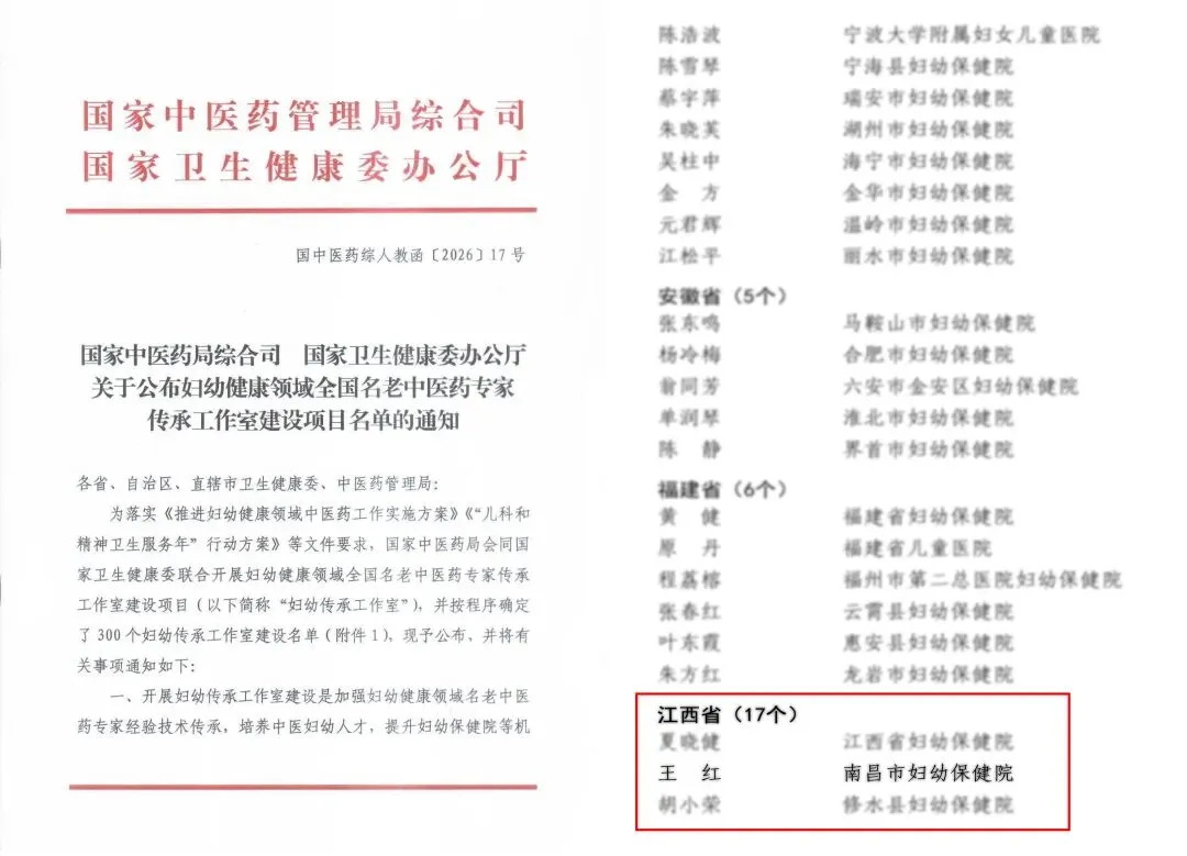近日,国家中医药管理局、国家卫生健康委联合公布了妇幼健康领域全国名老中医药专家传承工作室建设项目名单,南昌市人民医院肿瘤内科王红主任团队凭借深厚的中医药造诣、独特的学术思想和丰富的临床经验成功入选。此次入选国家级建设项目,标志着我院在中医药传承创新与妇幼健康服务深度融合方面迈上了新台阶。