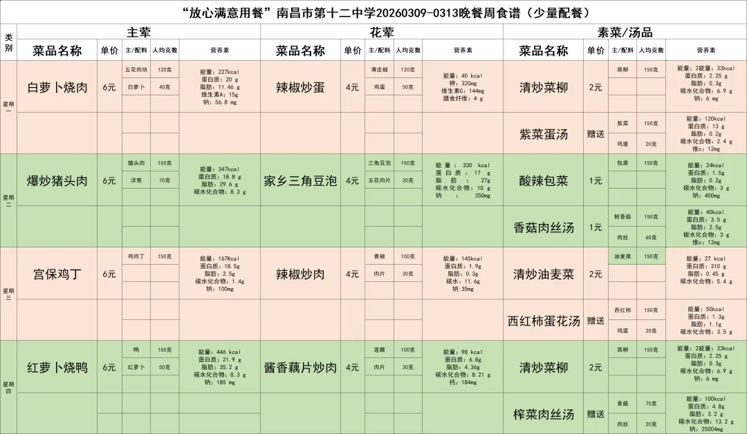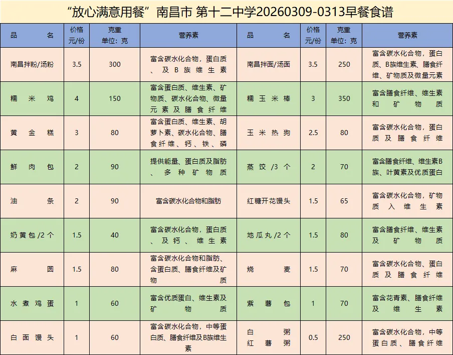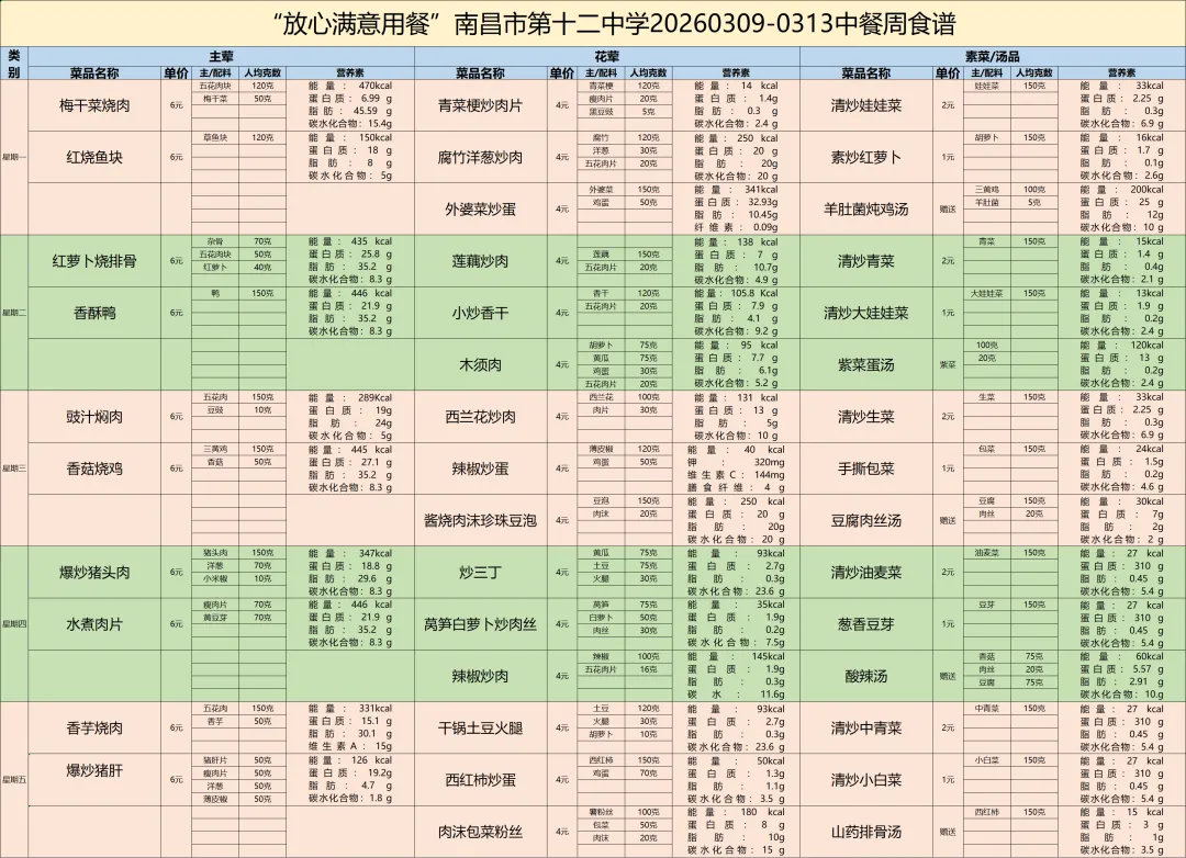 南昌市第十二中学食堂周营养食谱(3月9日—3月13日)