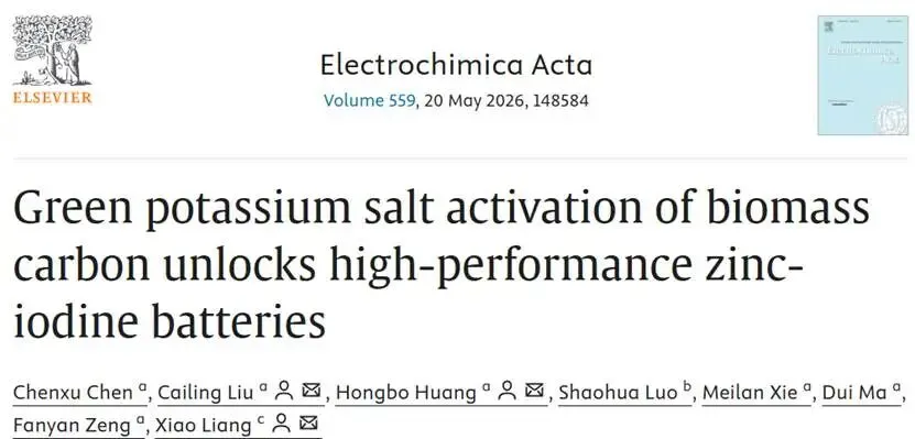其相关成果以题为“Green potassium salt activation of biomass carbon unlocks high-performance zinc-iodine batteries”在国际知名期刊《Electrochimica Acta》上发表。