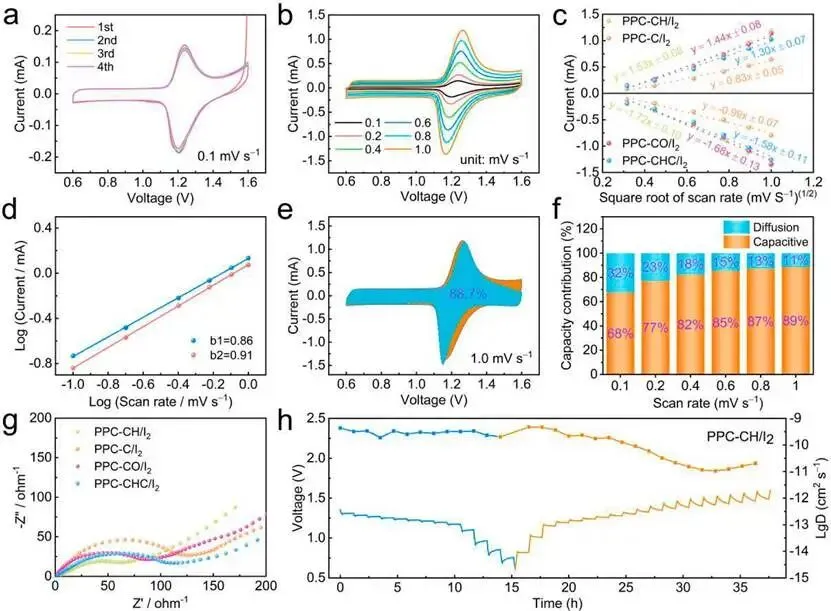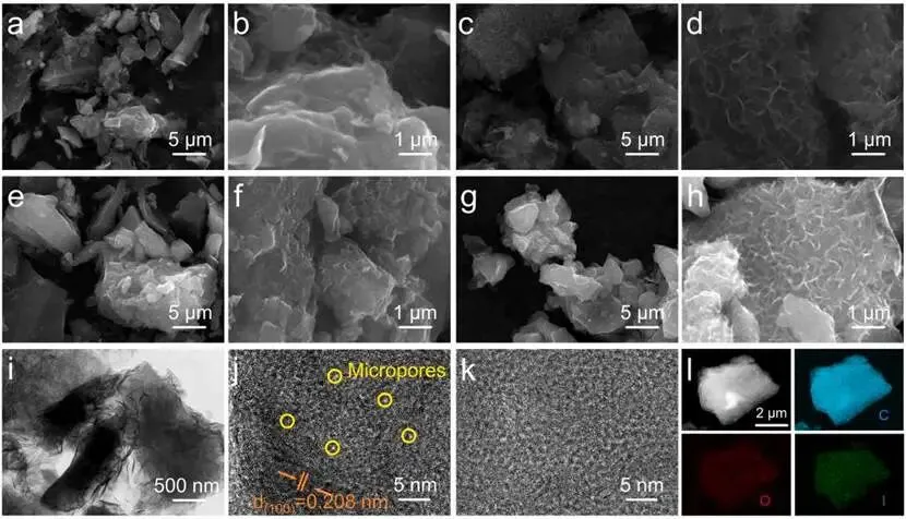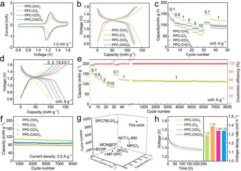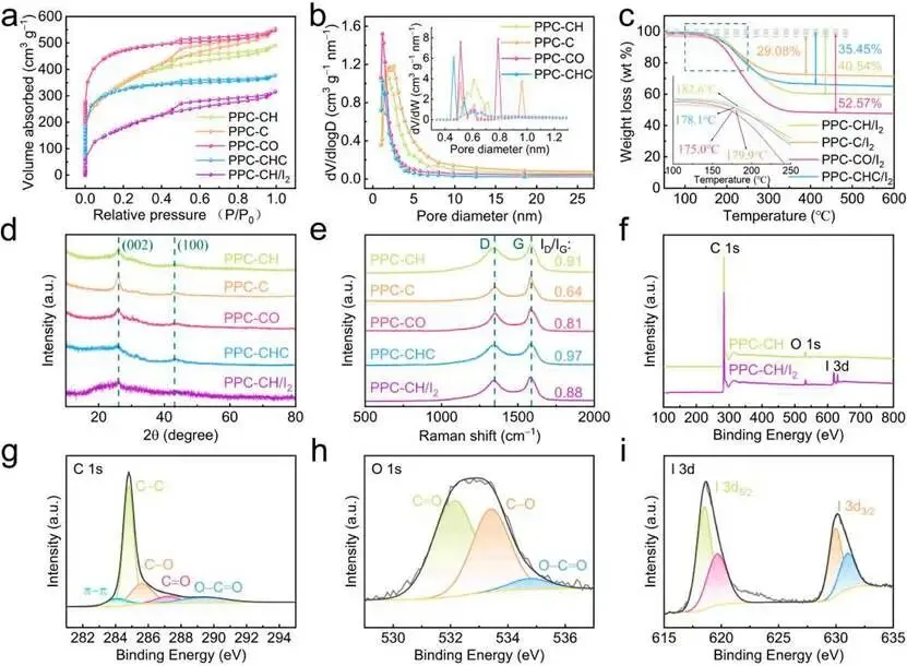 水系可充电锌碘(Zn–I₂)电池因其资源丰富、本征安全及成本低廉等优势,在大规模电网级储能应用中展现出重要前景。然而,其实际发展仍受限于多碘化物(I₃⁻/I₅⁻等)的严重穿梭效应、正极活性物质导电性差以及碘在充放电过程中的不可逆损失等问题。针对上述挑战,南昌航空大学Cailing Liu、Hongbo Huang团队&湖南大学梁宵教授以可再生花生壳生物质为碳前驱体,采用环境友好的弱碱性钾盐(KHCO₃、K₂CO₃、K₂C₂O₄·H₂O及CH₃COOK)活化策略,成功制备了一系列分级多孔碳材料。其中,KHCO₃活化所得样品(PPC–CH)展现出高度有序的致密堆叠层状结构、高比表面积(1842 m² g⁻¹)与丰富的微孔分布(微孔率72.3%,平均孔径0.61 nm),并兼具适度石墨化程度(ID/IG = 2.85),从而在保证优异电子传导能力的同时,提供充足的限域空间用于碘负载与转化。尤为关键的是,PPC–CH表面富含羰基、羟基等含氧官能团,结合其优化的微孔-介孔协同网络(微孔主导吸附固定,介孔保障离子快速传输),可高效锚定多碘化物中间体,显著抑制其溶解迁移与穿梭行为,并加速I₂/I⁻氧化还原反应动力学。电化学性能评估表明,基于PPC–CH/I₂正极组装的Zn–I₂电池展现出卓越的循环稳定性与倍率适应性:在2 A g⁻¹高电流密度下持续运行9000次后,仍保持99.9 mAh g⁻¹的放电比容量,对应容量保持率达88.2%;进一步构建的软包型原型器件(正极碘负载量3.2 mg cm⁻²,电解液用量15 μL cm⁻²)在0.5 A g⁻¹下循环600次后,放电比容量稳定维持在123.7 mAh g⁻¹,库仑效率始终高于99.3%。该工作不仅系统验证了弱碱盐活化生物质碳作为高性能碘宿主材料的可行性与工程适用性,更从“前驱体选择—活化机制—孔道/表面协同设计—电化学响应”全链条角度,为面向长寿命、高能量密度水系锌基电池的可持续电极材料开发提供了可复制的设计范式与实践路径。